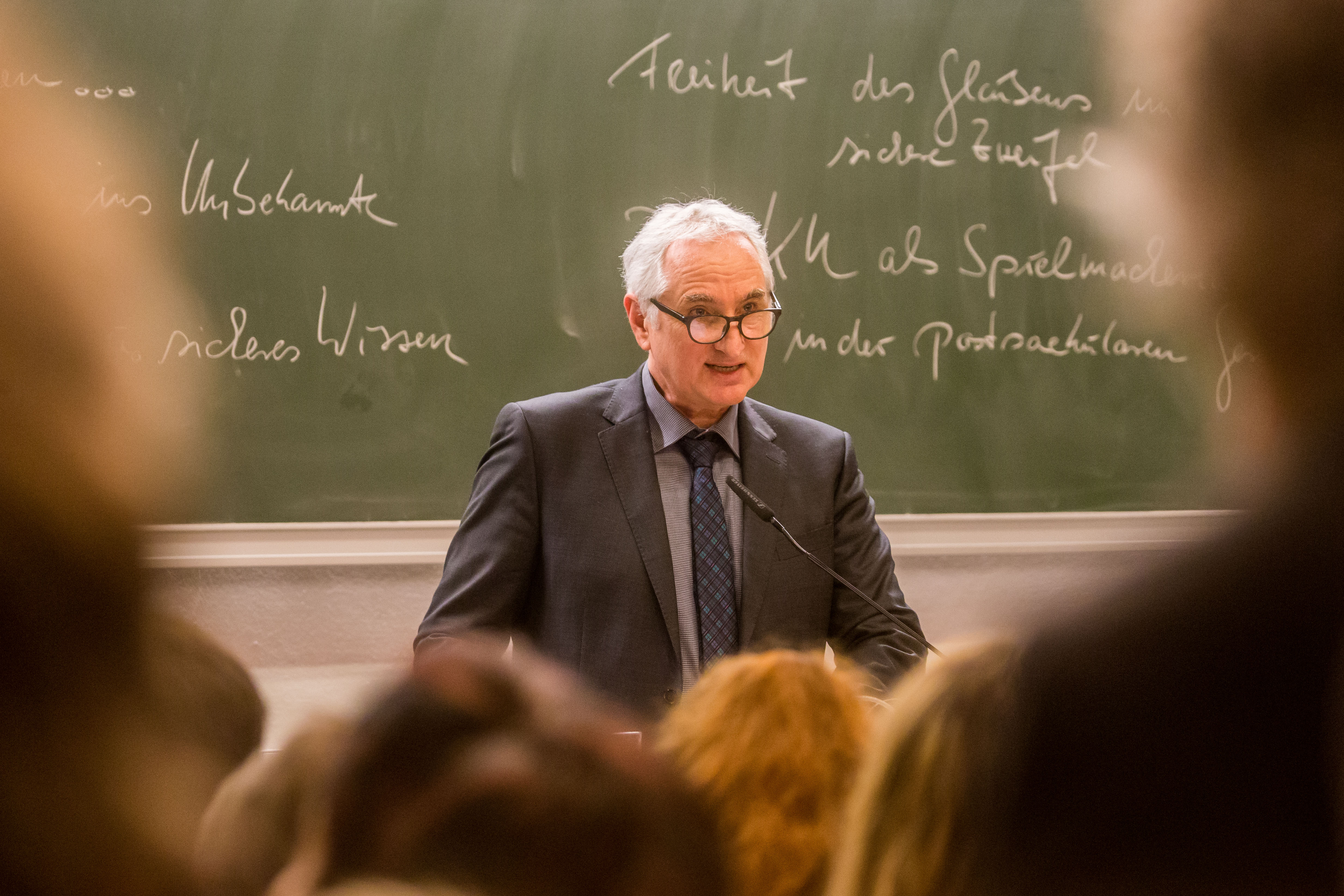Prof. Dr. Ulrich Bartosch bei seiner Abschiedsvorlesung, die unter dem Titel „Glauben und Wissen! oder Der Papst als Linksaußen des Club of Rome?“ stand. (Fotos: Klenk/upd)