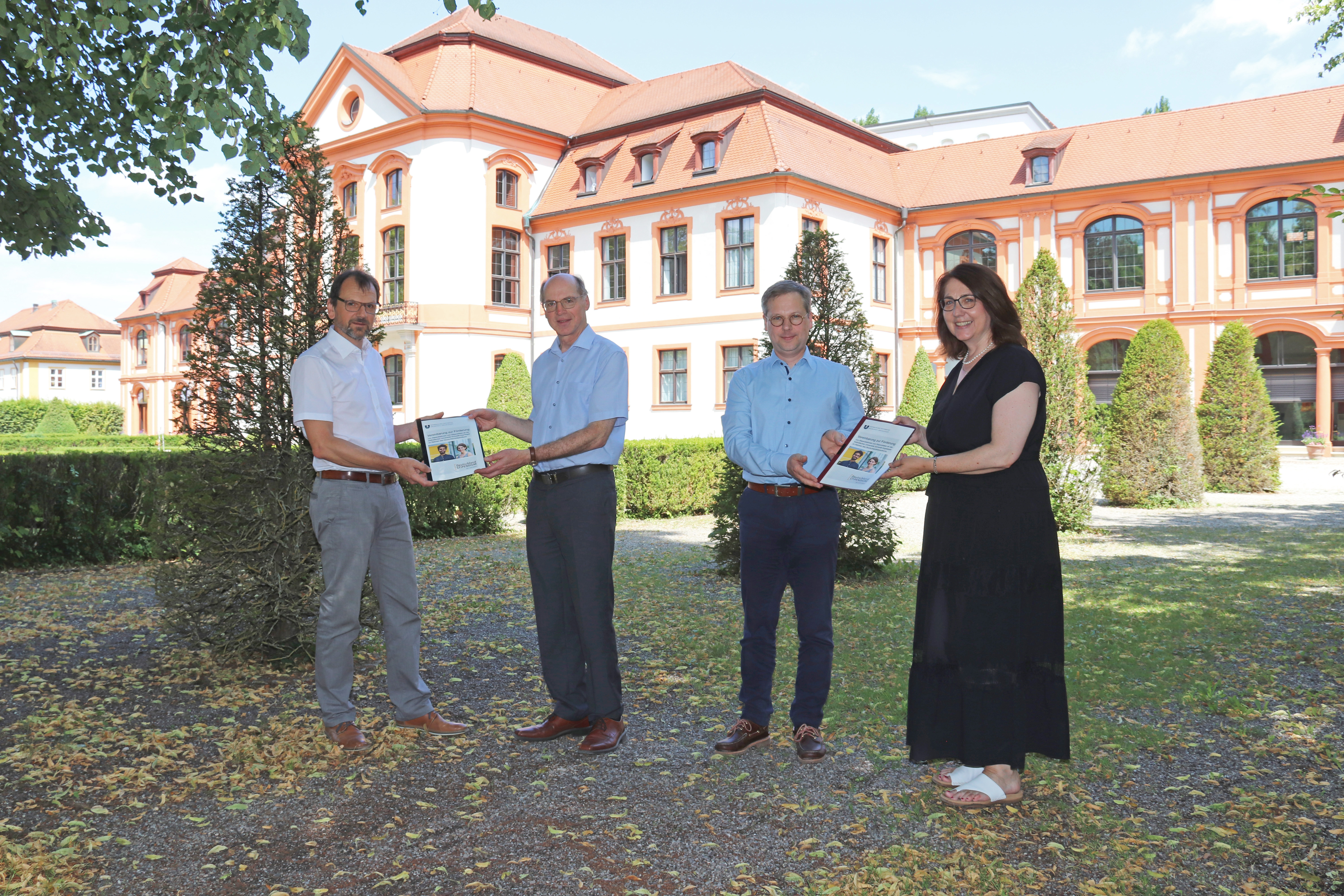 (v.l.) Werner Hausmann (Präsident des Lions Clubs Eichstätt), Vizepräsident Prof. Dr. Markus Eham, Tanja Schorer-Dremel (MdL) und Dr. Olaf Jelinski (Stabsstelle Alumni und Fundraising) bei der Übergabe der Fördervereinbarung für ein Deutschlandstipendium.