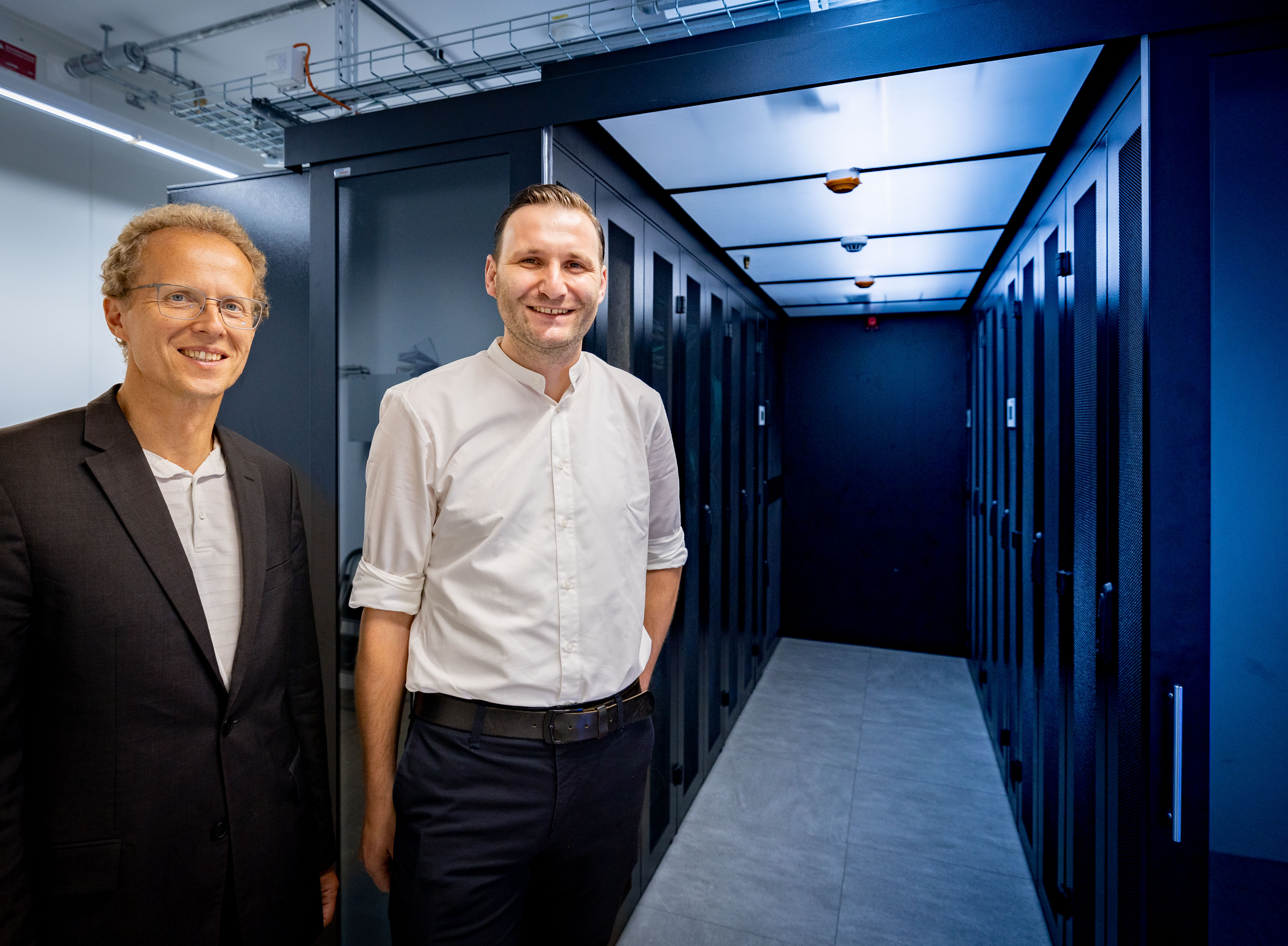 Dr. Nils Blümer (Leiter des Universitätsrechenzentrums; links) und Stefan Wenzel (Facility Management) im neuen Serverraum an der Wirtschaftswissenschaftlichen Fakultät Ingolstadt