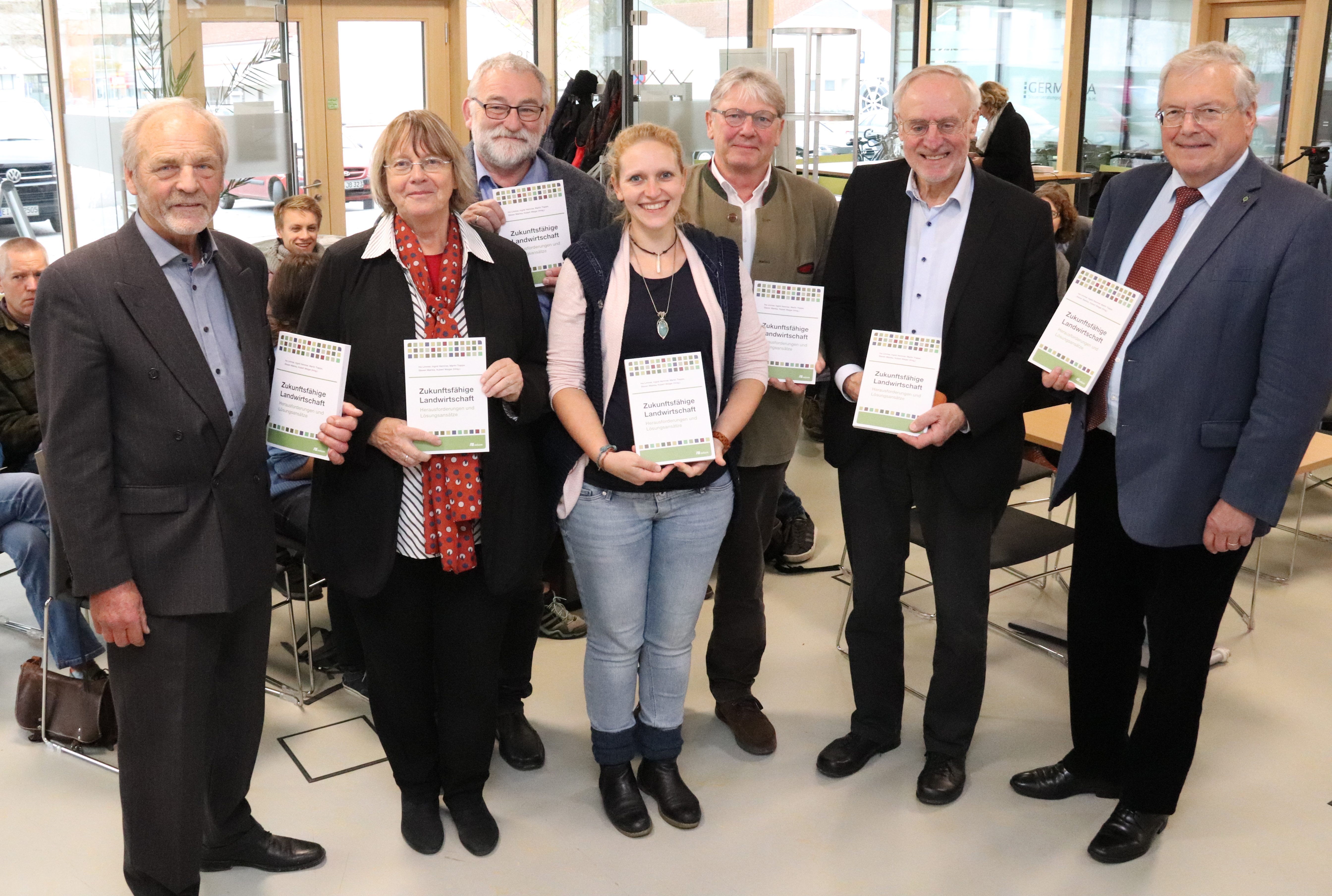 (v.l.) Biolandwirt Stephan Kreppold, Prof. Dr. Ingrid Hemmer (Professorin für Didaktik der Geographie und Nachhaltigkeitsbeauftragte der KU), der Biologe Prof. Dr. Jörg Hemmer (Universität Ulm), Ina Limmer (Assistentin der Nachhaltigkeitsbeauftragten), Dr. Rupert Ebner (Umweltreferent der Stadt Ingolstadt), Prof. Dr. Dr. h.c. Alois Heißenhuber (Früherer Inhaber des Lehrstuhls für Wirtschaftslehre des Landbaues an der TU München) und der BUND-Ehrenvorsitzende Prof. Dr. Hubert Weiger präsentierten...    »