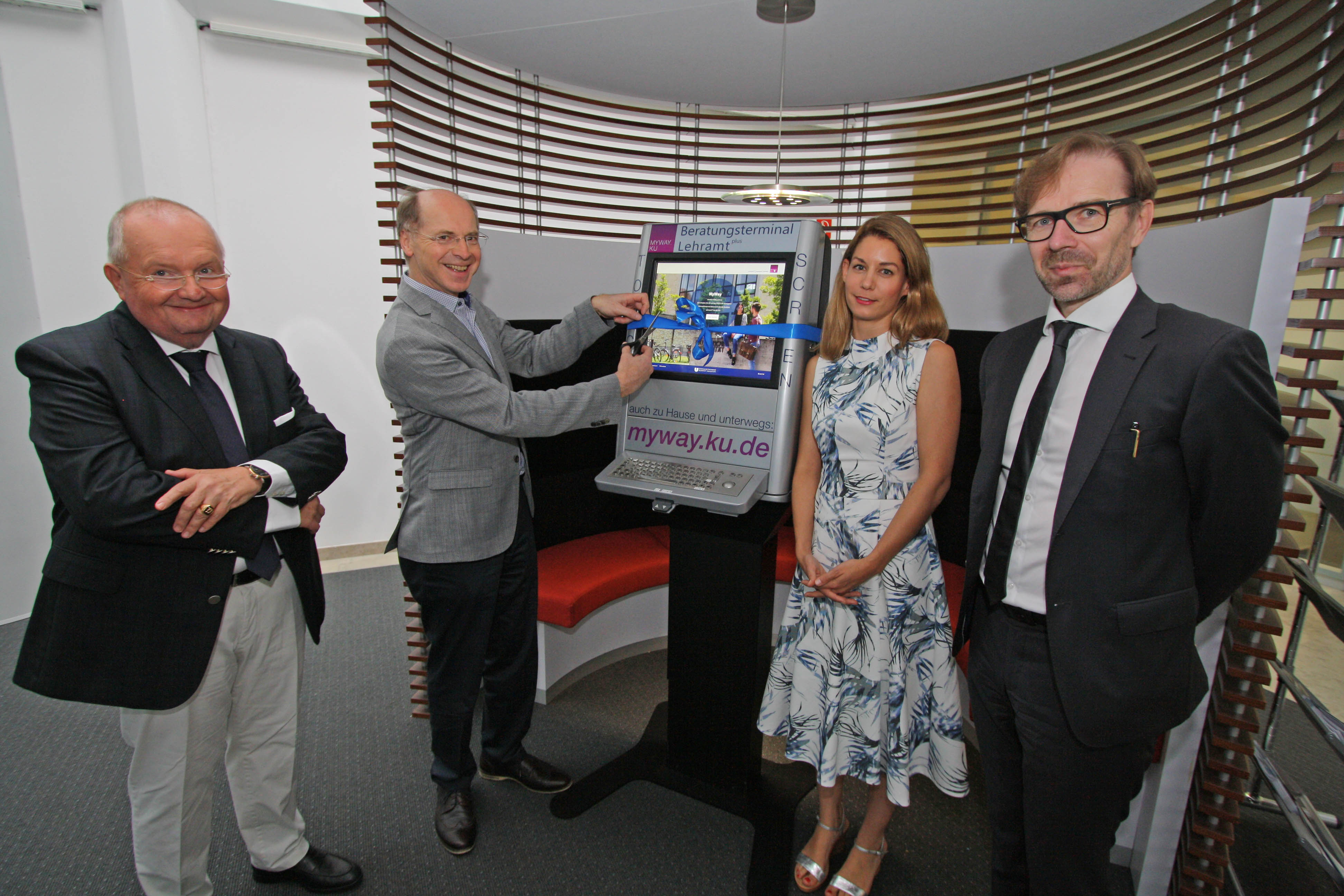 Einen neuen Service rund um das Lehramtsstudium an der KU hat das Zentrum für Lehrerbildung und Bildungsforschung der KU in Betrieb genommen. Über das Online-Portal „MYWAY“ können sich sowohl Studieninteressenten als auch aktuelle Lehramtsstudierende mit grundlegenden Informationen über ihren jeweiligen Studiengang versorgen. Dazu genügt es, unter der Adresse http://myway.ku.de den Studienbeginn, die Schulart sowie die Fächerkombination auszuwählen, um dann den passenden Studienverlaufsplan und Prüfungsordnungen zu erhalten. KU-Vizepräsident Prof. Dr. Markus Eham (2.v.l.) nahm eines von zwei Terminals des Lehramt-Beratungsservices „MyWay“ offiziell in Betrieb - im Beisein von (v.l.) Prof. Dr. Frank Zschaler (ehem. Leiter des ZLB und Initiator der Terminals), ZLB-Geschäftsführerin Birgit Langer und ZLB-Leiter Prof. Dr. Rainer Wenrich. (Foto: Schulte Strathaus) «