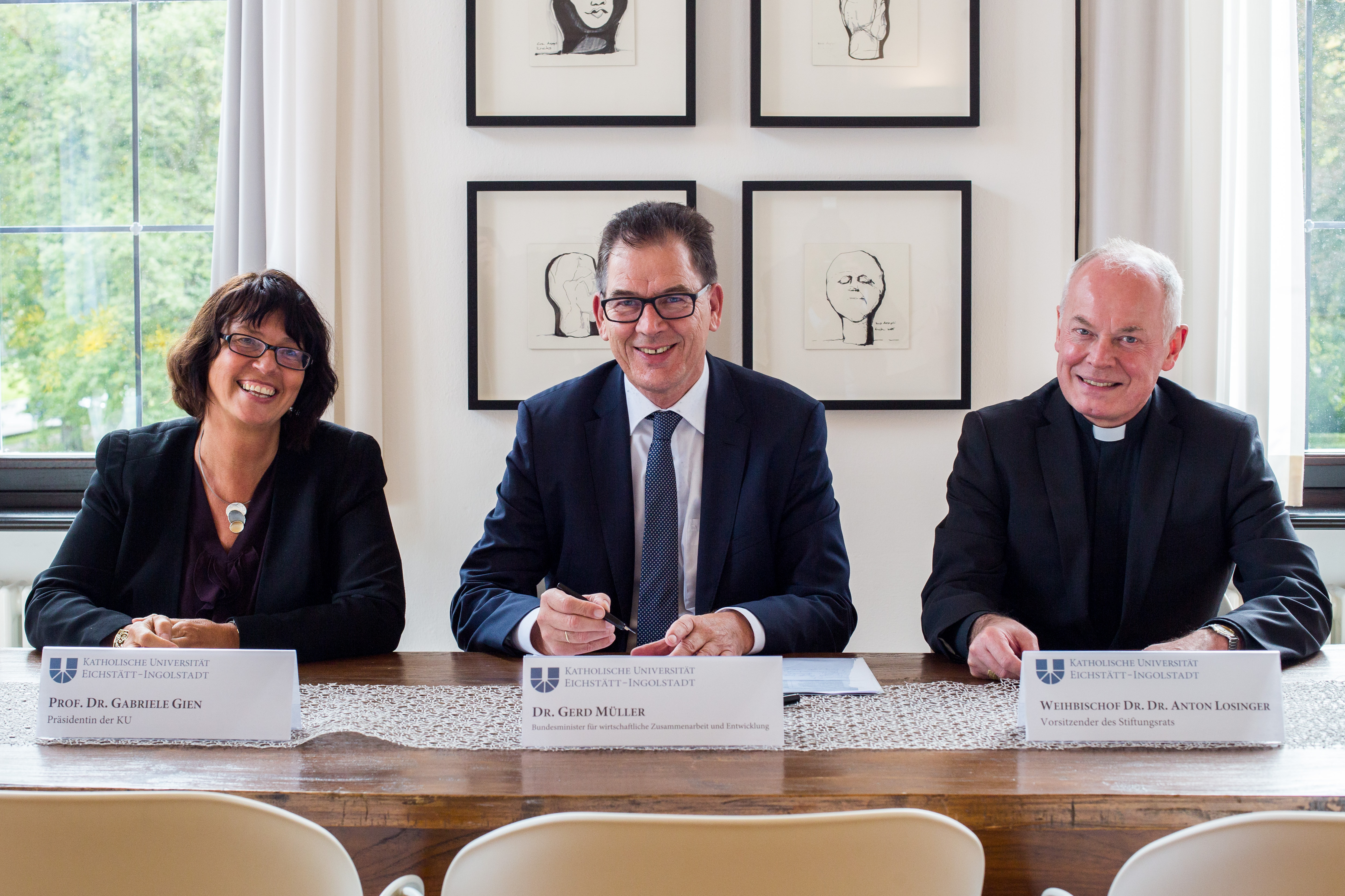 Bildinformation: (v.l.) KU-Präsidentin Prof. Dr. Gabriele Gien, Bundesentwicklungsminister Dr. Gerd Müller und Weihbischof Dr. Dr. Anton Losinger (Vorsitzender des Stiftungsrates der Stiftung Katholische Universität Eichstätt-Ingolstadt) bei der Unterzeichnung der Absichtserklärung. «