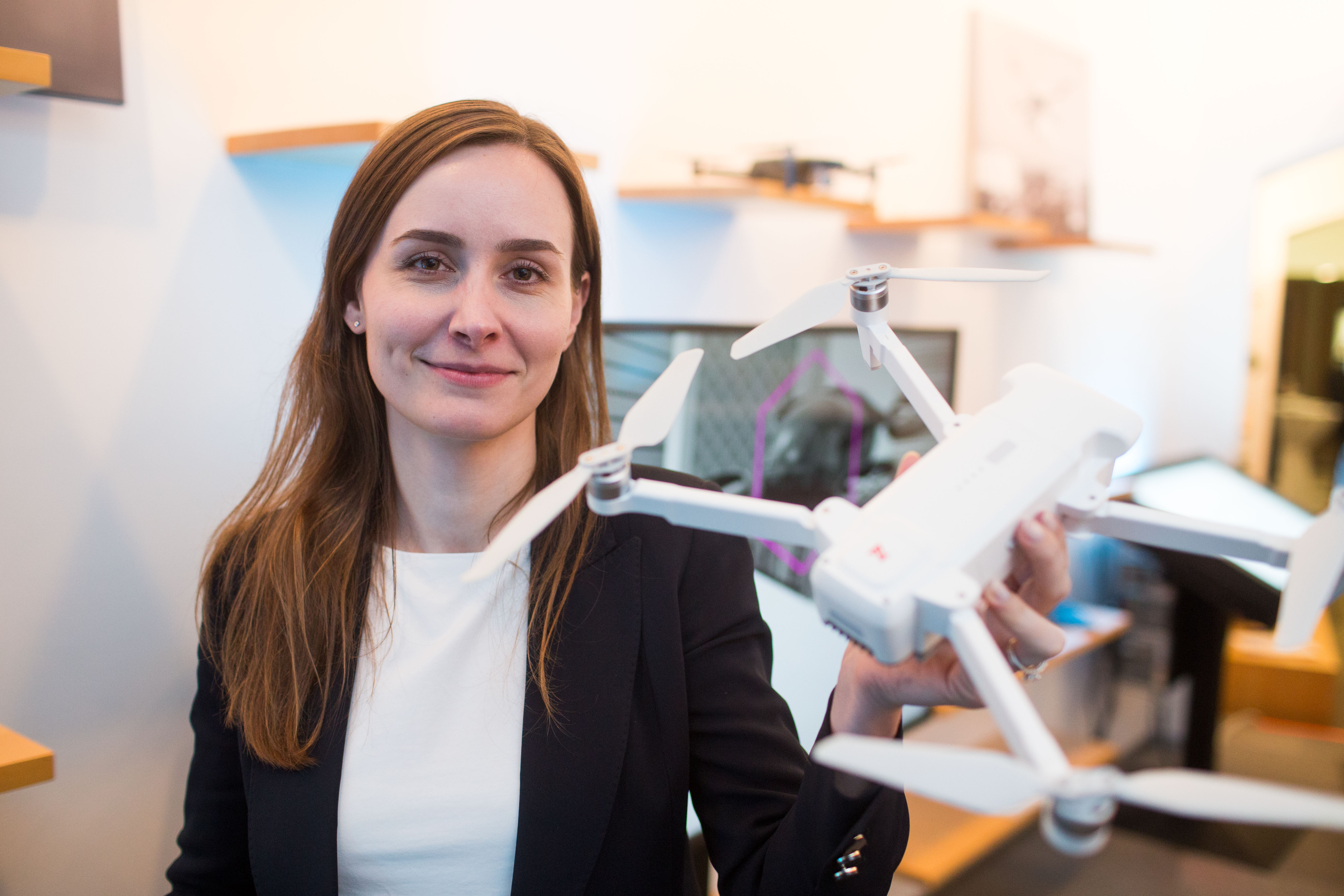 KU-Mitarbeiterin Frederica Janotta mit einem Drohnenmodell. Im Rahmen des Projekts GABI wird in Ingolstadt die Akzeptanz von Urban Air Mobility erforscht.