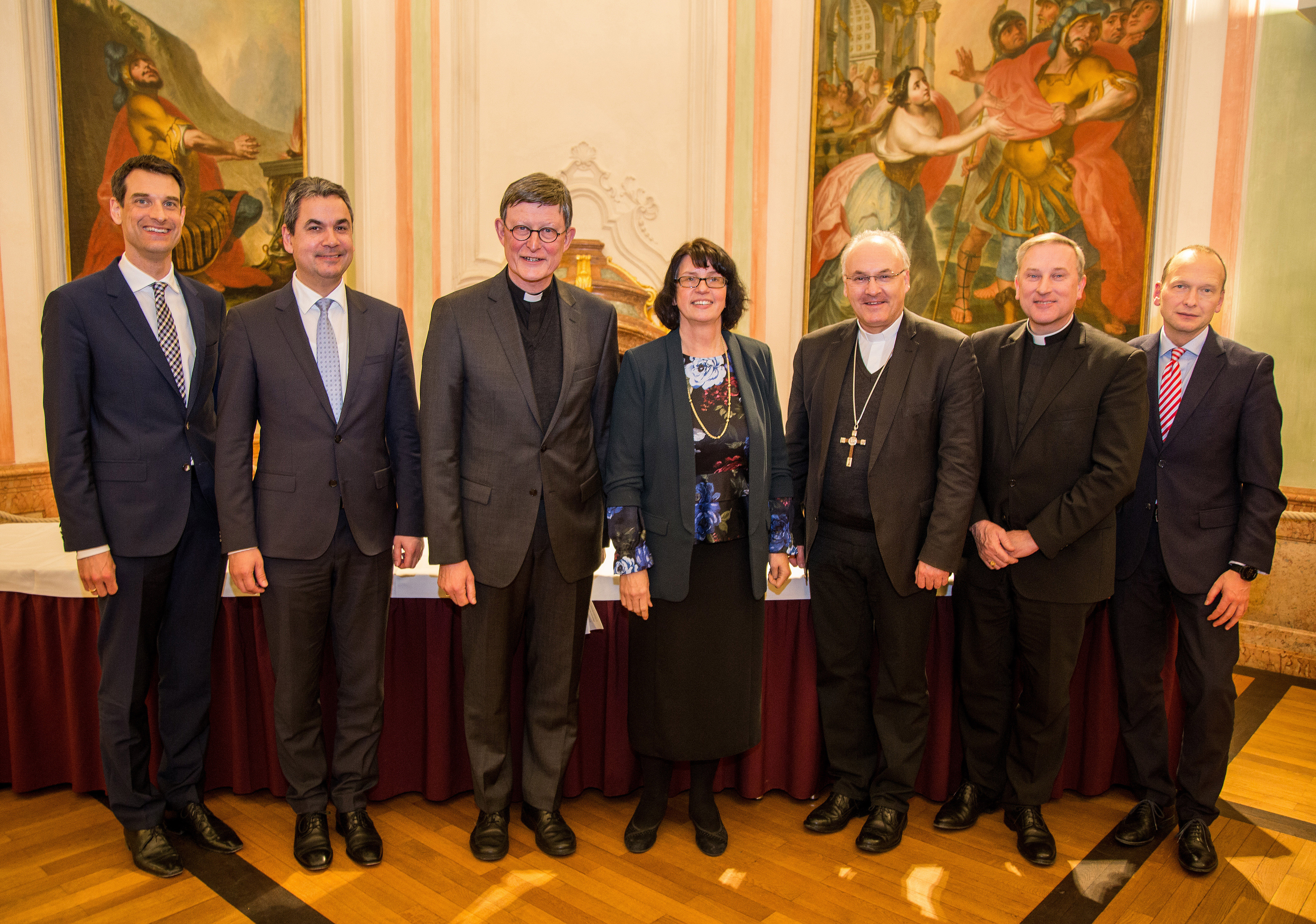 Mitglieder der Kommission Wissenschaft und Kultur der Deutschen Bischofskonferenz besuchen am Dienstag, 20. Februar 2018 die Katholische Universität Eichstätt-Ingolstadt. Von links: Vizepräsident Prof. Dr. Jens Hogreve, Vizepräsident Prof. Dr. Klaus Stüwe, Rainer Maria Kardinal Woelki (Erzbistum Köln), KU-Präsidentin Prof. Dr. Gabriele Gien, Bischof Dr. Rudolf Voderholzer (Bistum Regensburg), Weihbischof Wilfried Theising (Bistum Münster) sowie Kanzler Thomas Kleinert.
