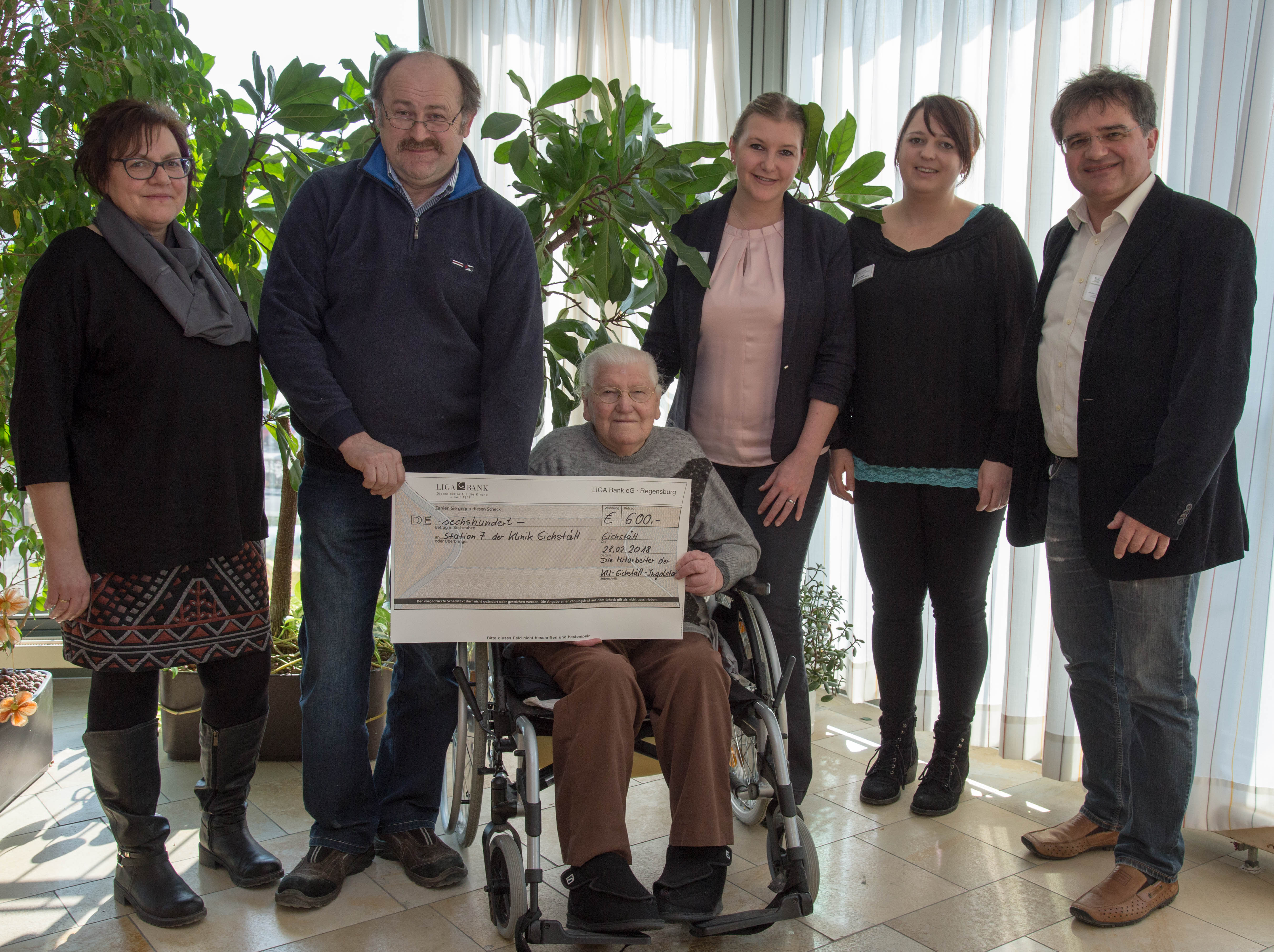 Bildunterzeile: Karin Heidrich und Manfred Baier überreichten die Spende der KU-Mitarbeiter für die Pflegestation an Walburga Heigl von der Bewohnervertretung, Stationsleiterin Sybille Walk und ihre Stellvertreterin Bianca Regler sowie Heimleiter Richard Nikol (von links).