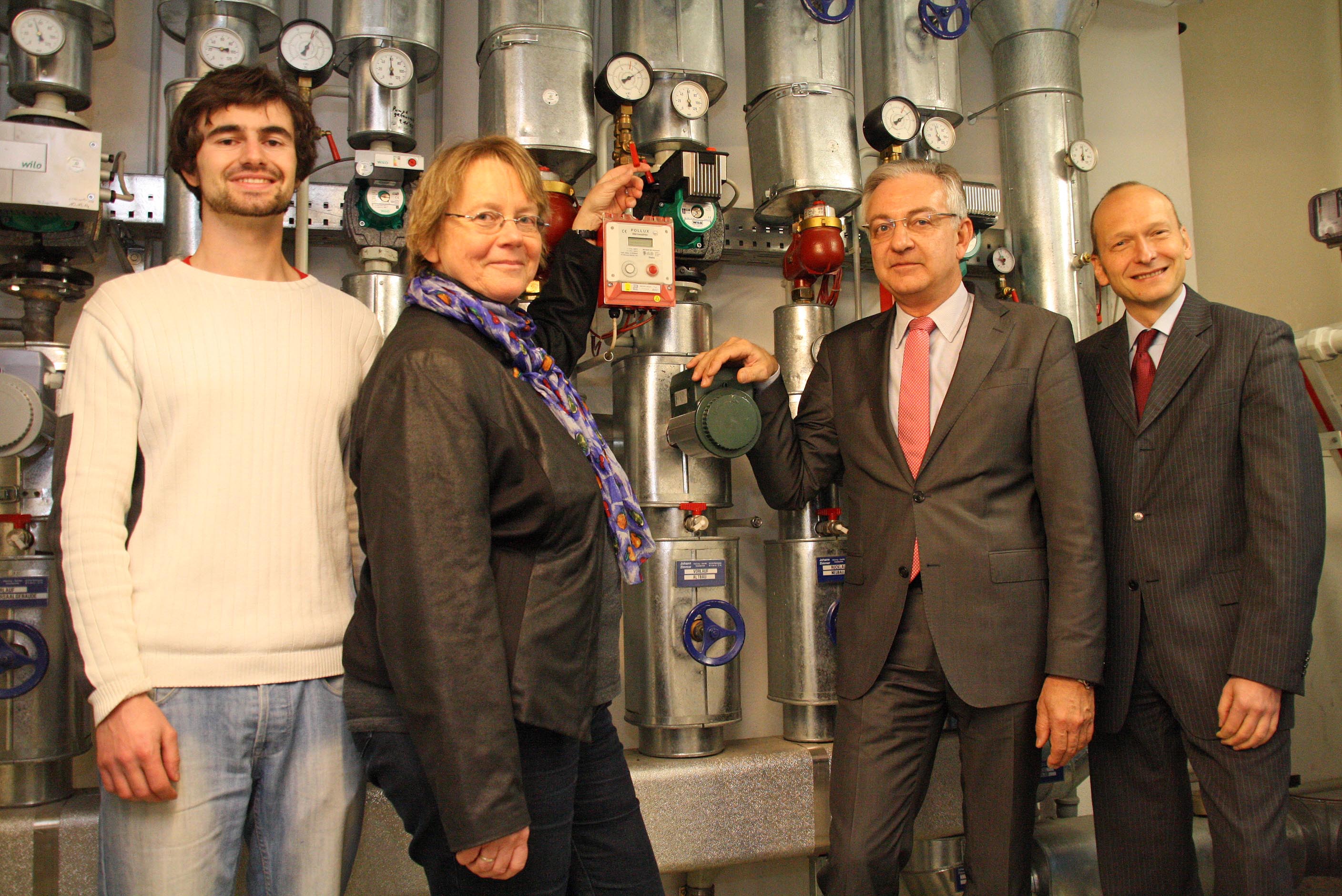 (v.r.) KU-Kanzler Thomas Kleinert, Wolfgang Brandl (Geschäftsführer der Stadtwerke Eichstätt), Prof. Dr. Ingrid Hemmer (Nachhaltigkeitsbeauftragte der KU) und Johannes Baumann (Leiter des Bereichs Umweltmanagement) bei einem Ortstermin im Heizraum der Teilbibliothek „Aula“, die bislang mit Erdgas versorgt wurde. Für dieses und sieben weitere Gebäude wurde nun ein Vertrag zur Belieferung mit Biogas geschlossen.