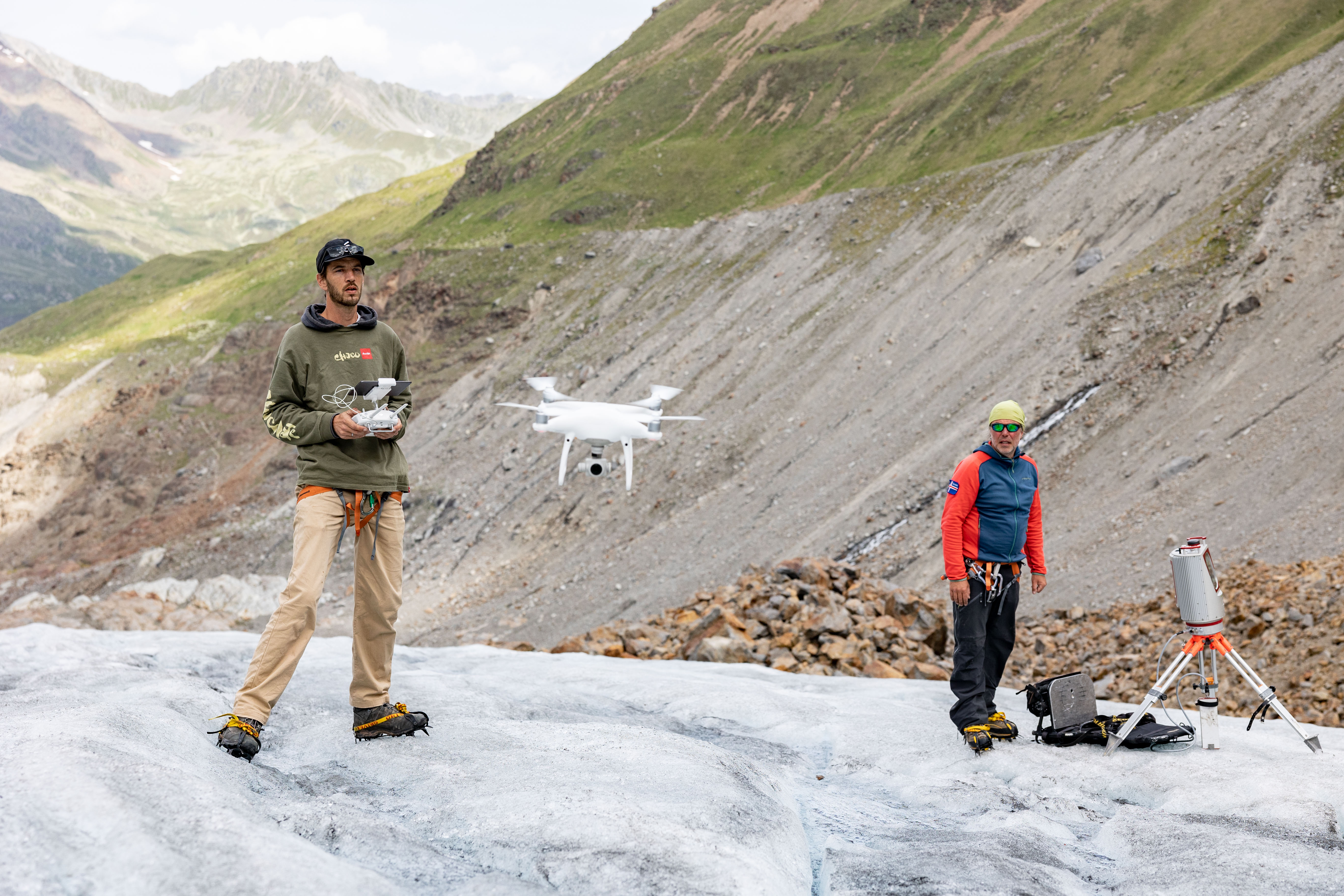 PD Dr. Florian Haas und Dr. Manuel Stark vermessen in einem Forschungsprojekt die Gletscher in den Alpen