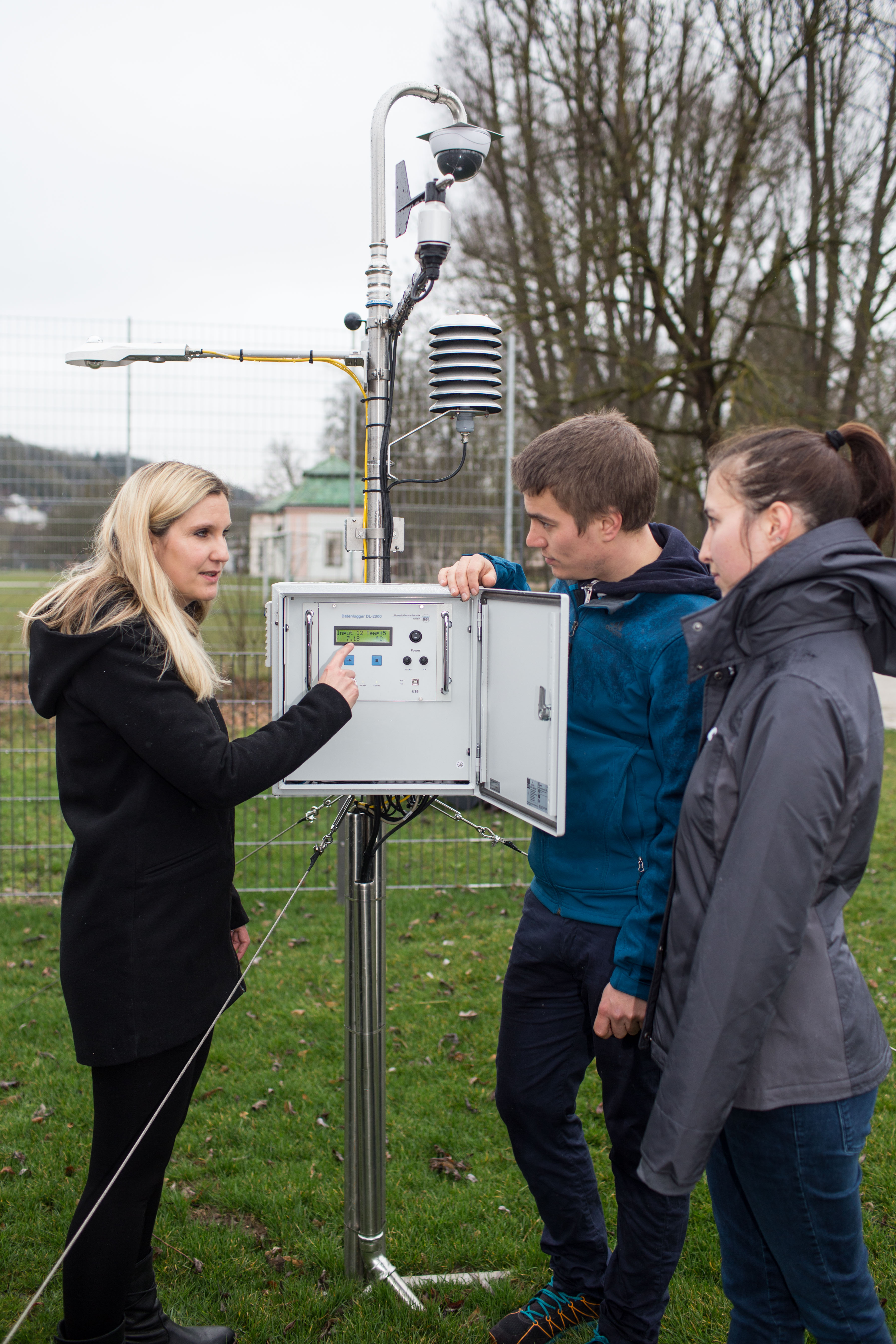 Prof. Dr. Susanne Jochner-Oette (Bildmitte), Physische Geographie/Landschaftsökologie und nachhaltige Ökosystementwicklung, erklärt Studierenden die neue Wetterstation auf dem Campus der Katholischen Universität Eichstätt-Ingolstadt