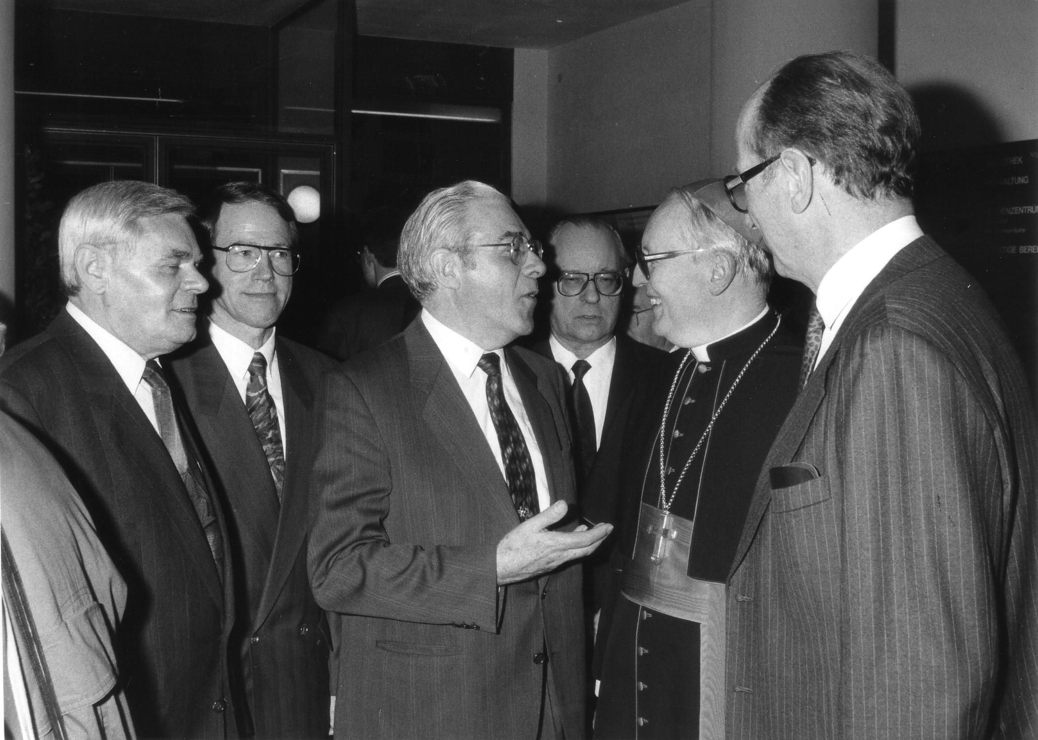 Gründung der Wirtschaftswissenschaftlichen Fakultät 1989. Von links: Landrat Konrad Regler, Peter Schnell Oberbürgermeister der Stadt Ingolstdt, Prof. Dr. Eduard Gaugler Gründungsdekan der WFI, Prof. Dr. Franz Knöpfle Ehrensenator an der KU, Kardinal Friedrich Wetter, Prof. Dr. Nikolaus Lobkowicz Präsident der KU