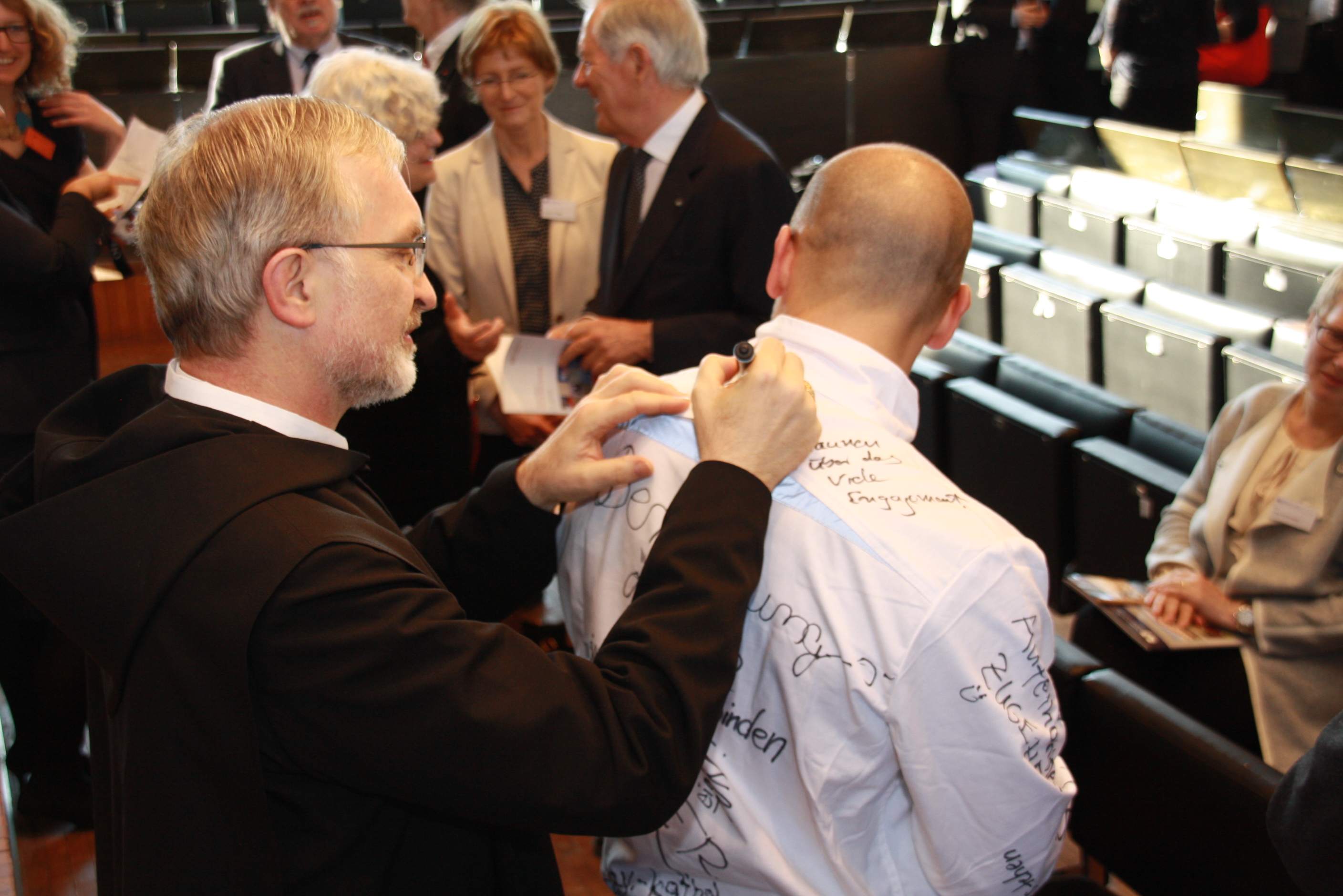 Auf "wandelnden Gedanken" konnten die Teilnehmer die Tagung - wie hier Eichstätts Bischof Gregor Maria Hanke - kurze Statements zum Thema "Flucht und Migration" hinterlassen.