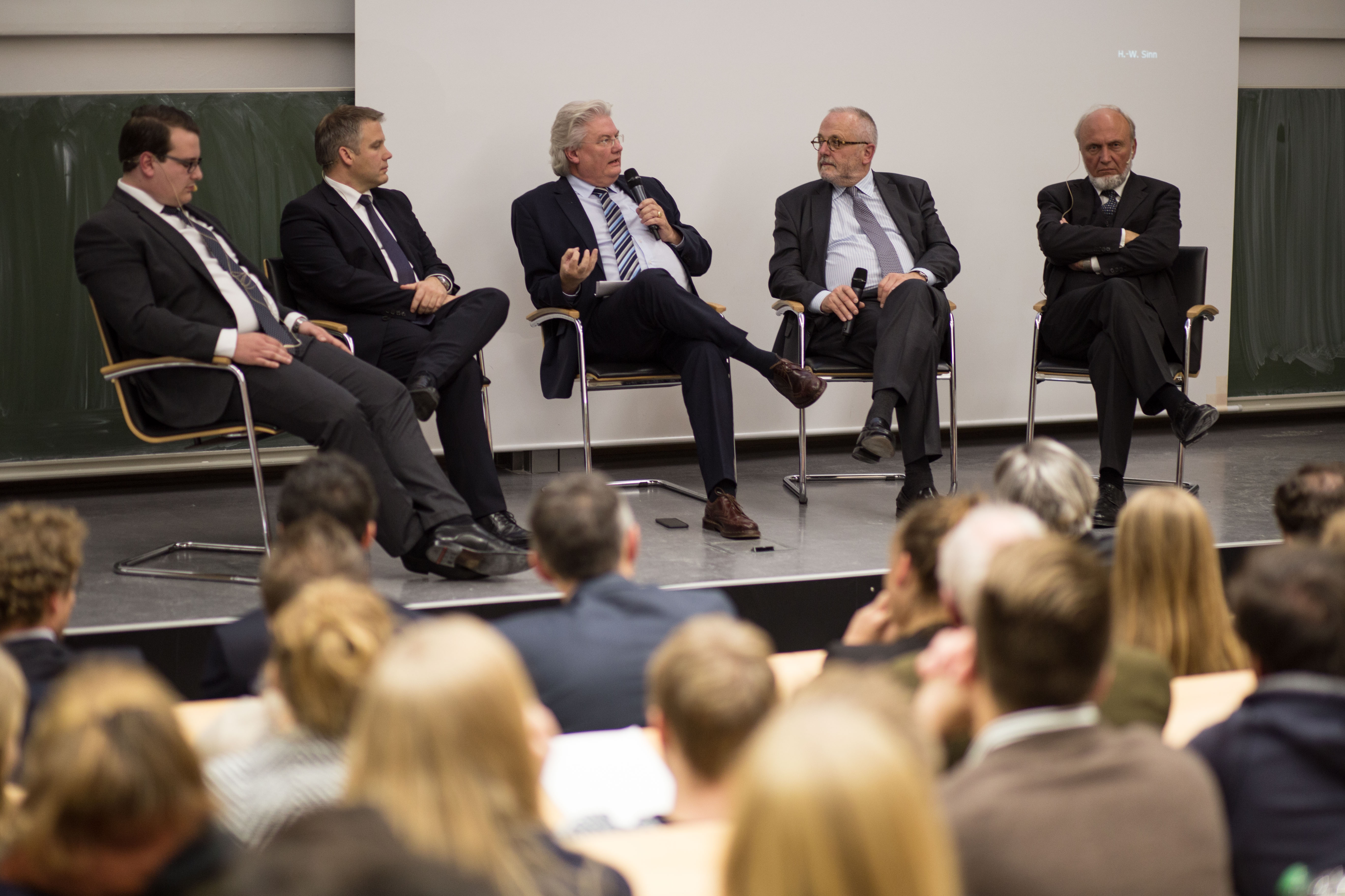 Podiumsdiskussion beim Dies oeconomicus der Wirtschaftswissenschaftlichen Fakultät der KU am 8. November 2016 mit Michael Kosch (Student der WFI), Christian Lösel (OB von Ingolstadt), Sigmund Gottlieb (Chefredakteur des Bayerischen Rundfunks), Rupert Graf Strachwitz (Direktor des Maecenata Instituts) und Wirtschaftswissenschaftler Prof. Dr. Hans-Werner Sinn (von links)