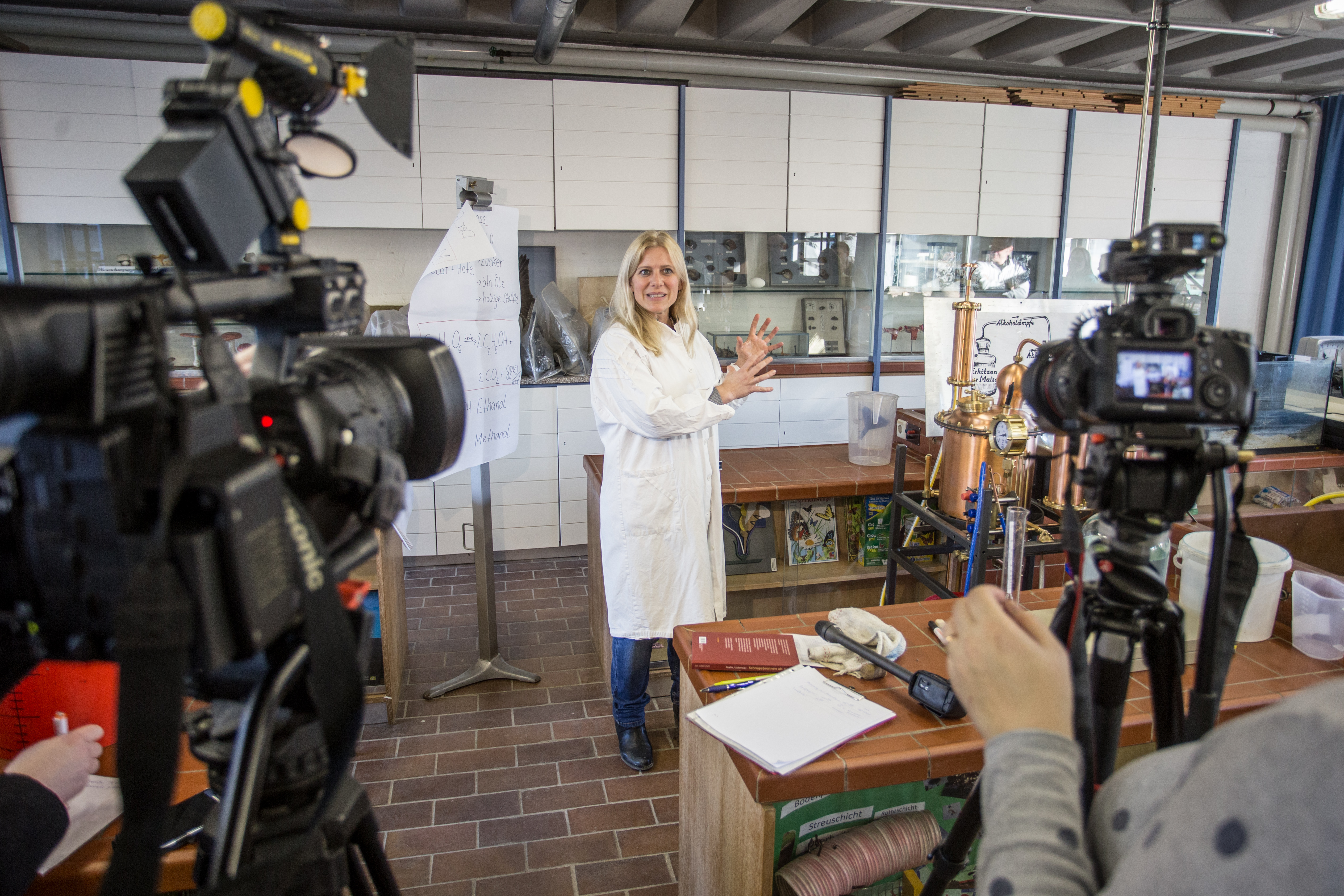 Im Rahmen einer Lehrverstaltung des Faches Didaktik der Biologie nimmt die Katholische Universität Eichstätt-Ingolstadt am 16. Februar 2017 eine Schnapsdestillerie in Betrieb. Studierende erfahren in dem Seminar, wie aus den Zwetschgen des unieigenen Kapuzinergartens ein 40-prozentiger Schnaps entsteht. Für das Obstbrennen hat das Zollamt der KU eine Genehmigung erteilt. Im Bild Biologie-Dozentin Dr. Helga Rolletschek, die vor Journalisten den Prozess des Schnapsbrennens erklärt.