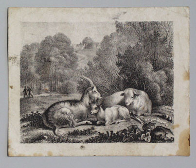 [Ziegenbock, Schaf und Kitz in Landschaft]