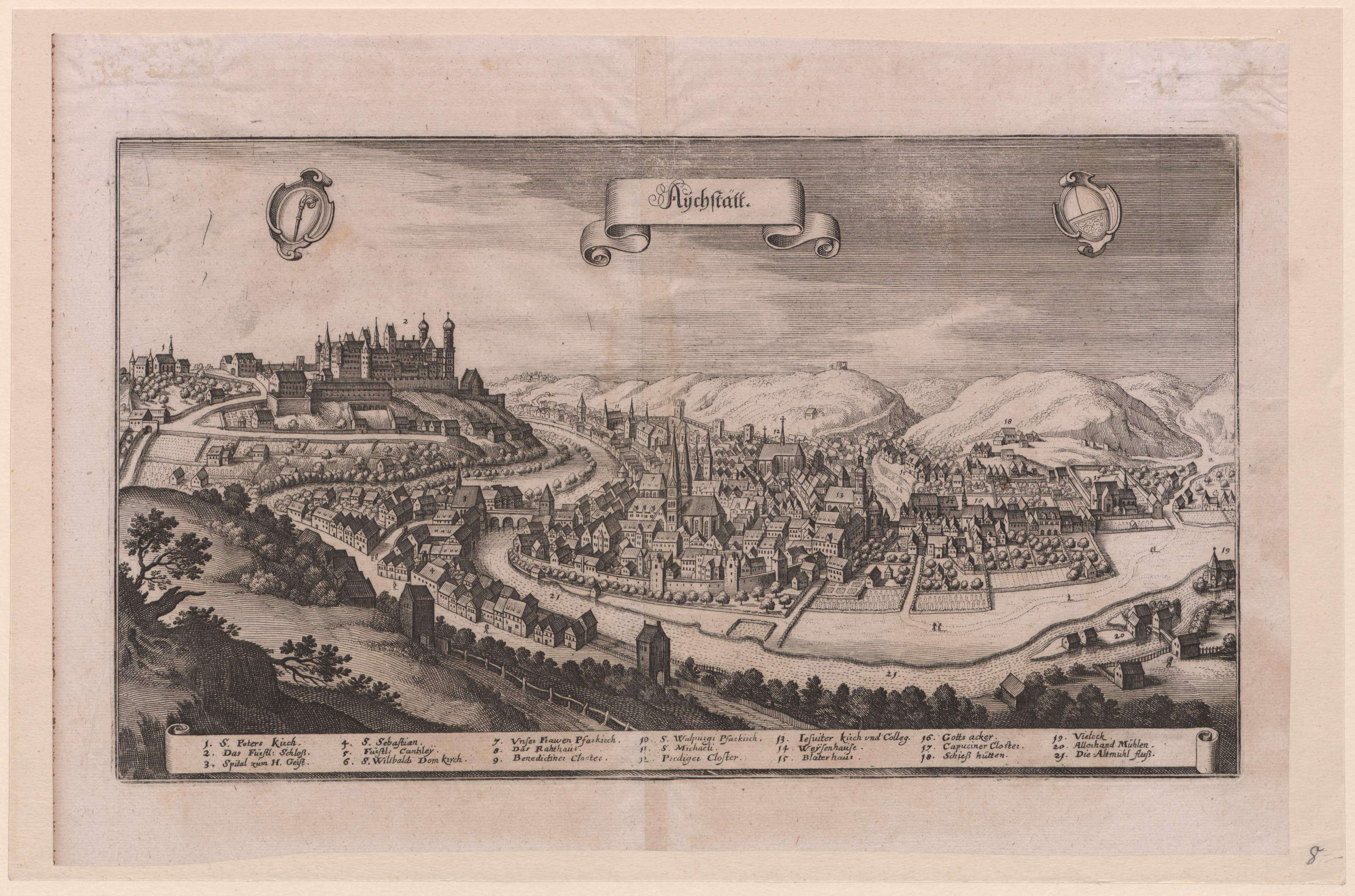 Aus: Topographia Franconiae / An tag gegeben vnd Verlegt Durch Matth. Merian. [Textverf.: Martin Zeiller]. - Franckfurt : Merian, [zuerst 1648, vermutlich spätere Auflage]. - Vgl.: Hartmann, Simone: Eichstätt in Stadtansichten, Bd. 1(2006), S. 60-68