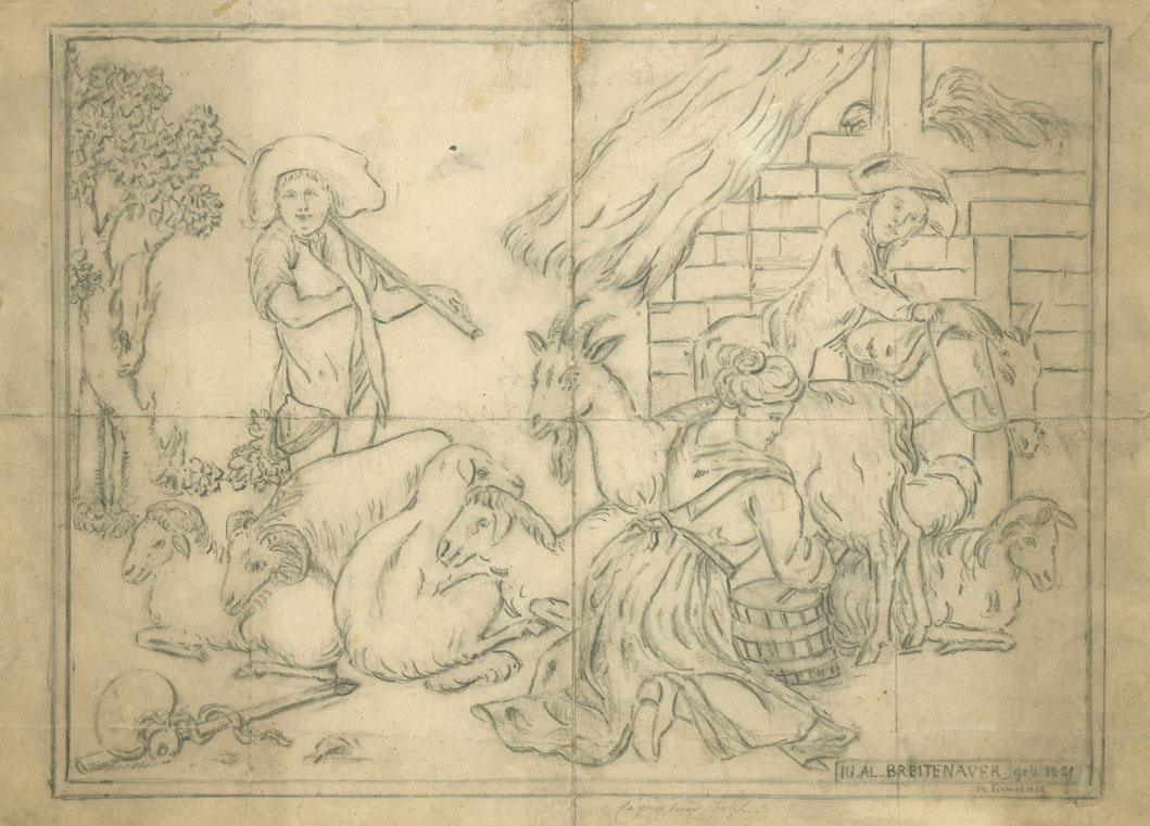 [vor einem gemauerten Stadel mehrere Schafe mit Schäfer, eine Frau melkt eine Ziege, dahinter ein Mann auf einem Esel ; Zeichnung einer Ofenplatte, wahrscheinlich gegossen im Hüttenwerk Obereichstätt]
