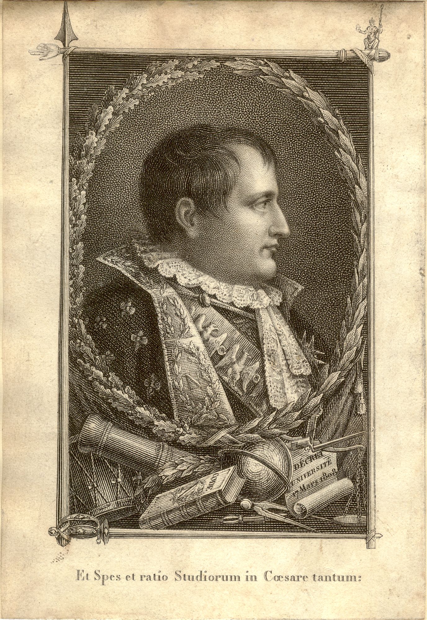 [Brustbild Napoleons im Profil im Krönungsornat, in ovalem Lorbeerkranz, mit diversen Attributen]