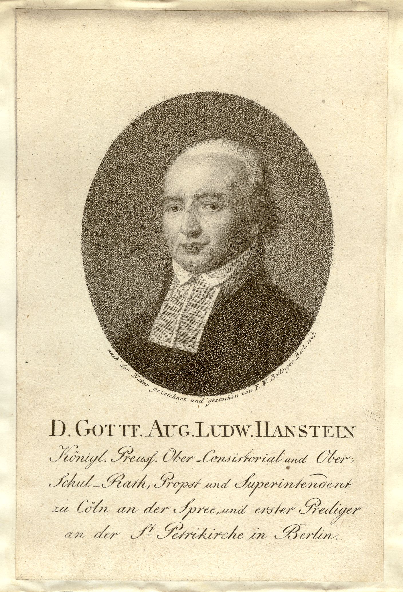 Königl. Preuss. Ober-Consistorial und Ober-Schul-Rath, Propst und Superintendent zu Cöln an der Spree, und erster Prediger an der St. Petrikirche in Berlin ; [Brustbild nach links]