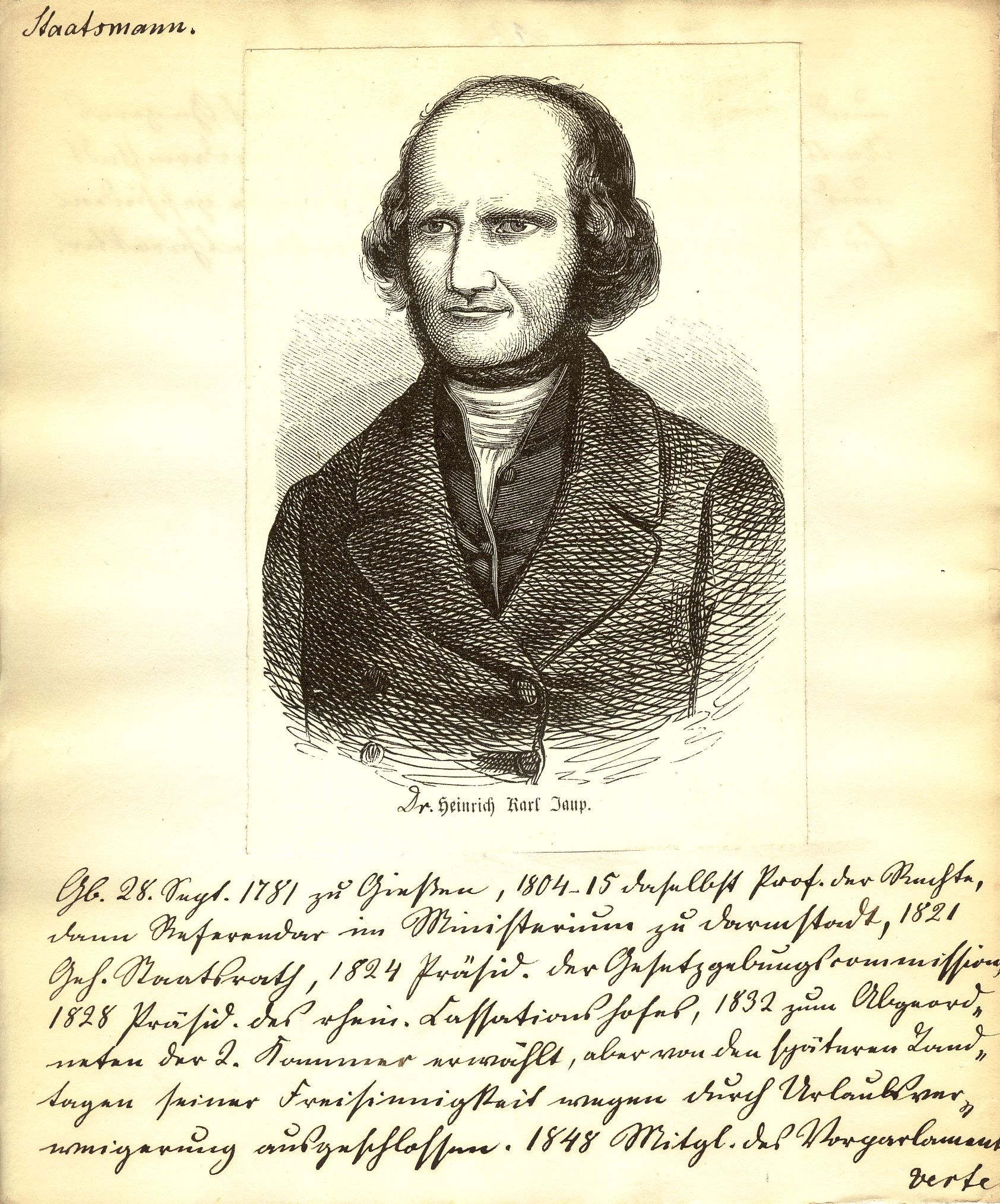 Holzstich; ca. 10,2 x 7,5 cm. - Handschriftlich der Titel "Dr." vor dem Namen angegeben. - Auf Papier mit umfangreichen handschriftlichen biographischen Angaben aufgeklebt. - MIT DIGITALAUFNAHME