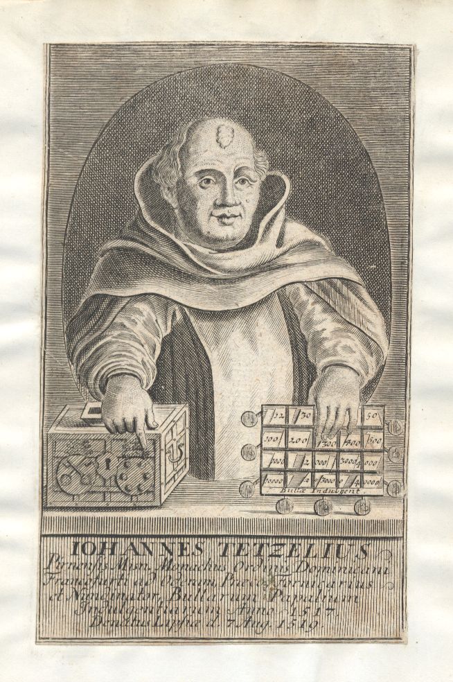 Pirnensis Misn. Monachus Ordinis Dominicani Francofurti ad Oderam, Praeco, Fornicarius et Nundinator, Bullarum Papalium Indulgentiarum Anno 1517. Denatus Lipsiae d. 7 Aug. 1519 ; [Halbfigur im Oval mit Geldkasten und Ablaßbriefen]