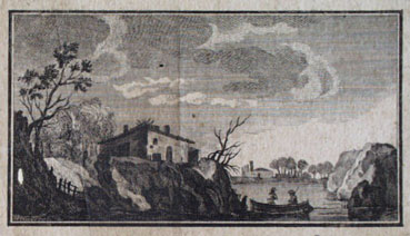[Ansicht eines ärmlichen Hauses auf einem Felsen an einem Fluß, davor 2 Männer in einem Boot; im Hintergrund ein weiteres Haus]