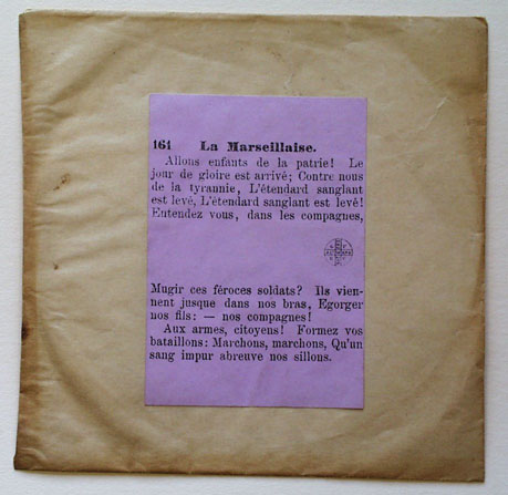 Kat.-Nr. 161. - Breveté S.G.D.G. - Anm.: Sachtitel u. Katalognr. geätzt. Die unbespielte Plattenrückseite u. d. Umschlaghülle enthalten je ein Papieretikett mit d. gesungenen Text: 161 La Marseillaise. || Allons enfants de la patrie! Le || jour de gloire est arrivé; Contre nous || de la tyrannie, L'étendard sanglant || est levé, L'étendard sanglant est levé! || Entendez vouz, dans les compagnes, || Mugir ces féroces soldats? Ils vien- || nent jusque dans nos bras, Egorger || nos fils: - nos com...    »