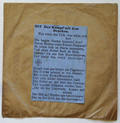 Kat.-Nr. 207. - Anm.: In der Universitätsbibliothek Eichstätt ist nur die Umschlaghülle vorhanden. Auf dieser befindet sich ein Papieretikett mit folgendem Text: 207 Der Kampf mit dem || Drachen. || Was rennt das Volk, was wälzt sich || dort || Die langen Gassen brausend fort? || Stürzt Rhodus unter Feuers Flammen? || Es rottet sich im Sturm zusammen, || Und einen Reiter hoch zu Ross, || Gewahr' ich aus dem Menschentross; || Und hinter ihm, welch' Abenteuer! || [Absatz mit Emblem] || Bringt man geschleppt ein Ungeheuer; || Ein Drache scheint es von Gestalt, || Mit weiten Krokodilesrachen, || Und alles blickt verwundert bald || Den Ritter an und bald den Drachen. || Und tausend Stimmen werden laut: || "Das ist der Lindwurm, kommt und || schaut, || Der Hirt und Herden uns verschlungen! || Das ist der Held, der ihn bezwungen!" . - MIT DIGITALAUFNAHME. - Kommentar von Stephan Puille, FHTW Berlin, 03.03.2017: "Leere Plattenhülle mit neuer Katalognummer 207 und Firmenzeichen. [Hinweis: Die alte, eingeritzte Katalognummer hätte „R 387“ gelautet, die erste neue, eingeschlagene Katalognummer wäre „7“ gewesen]". - Zur allgemeinen Bewertung der Eichstätter Platten von Emil Berliner's Grammophon durch Herrn Puille s. unter der Signatur: 19/1 T1.232-262