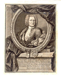 Sac. Caes. Maj. Archiater, S. R. I. Nobilis et Comes Palatinus, Sereniss. Marchion. Onoldo-Brandenb. Medic. Primarius et Consiliarius Aulicus, Academiae Imperial. Naturae Curiosorum Praeses, Physicus Norimbergensis, Universitatis Altorfinae Ordinisque Medici Senior ; Nat. Jenae d. XIV. Junii MDCLXXVII. Denat. Altorfii d. XIV. Julii MDCCXXXV ; [Brustbild nach links, Kopf nach rechts gewandt]