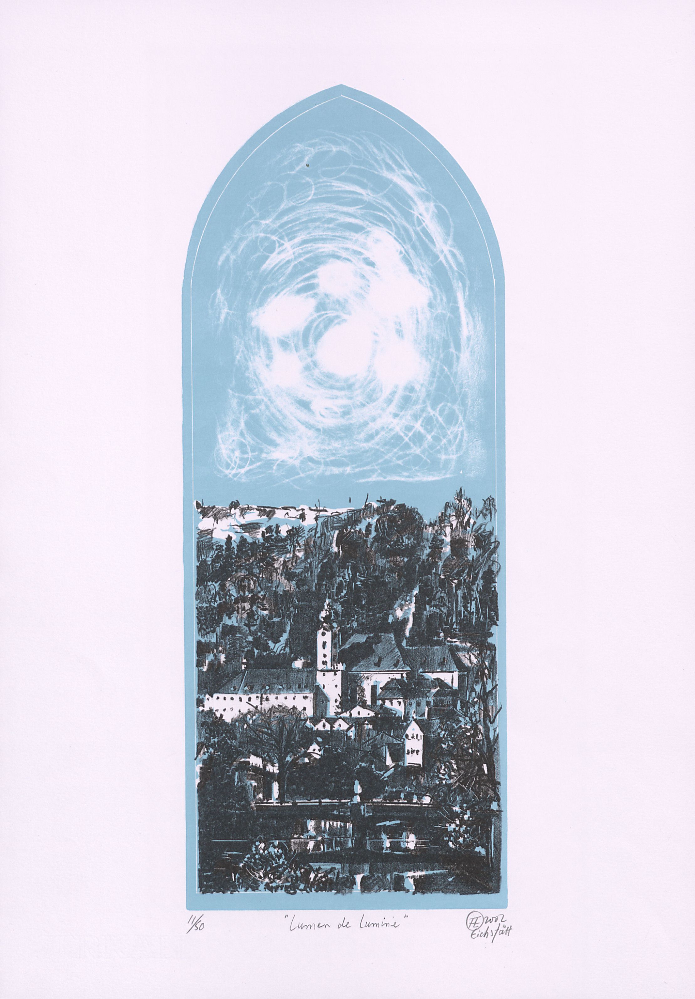 Kreidelithographie auf hellblauer Tonplatte; ca. 22 x 16,5 cm (Ansicht) bzw. 44,5 x 17,4 cm (Tonplatte). - Vom Künstler mit Bleistift bezeichnet, datiert, numeriert (11/50) und signiert. - MIT DIGITALAUFNAHME