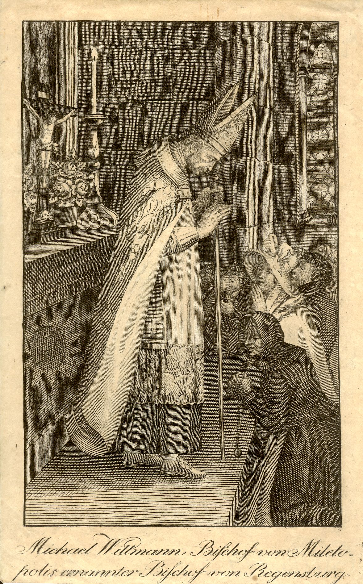 Bischof von Miletopolis, ernannter Bischof von Regensburg ; [Ganze Figur im Profil nach rechts vor dem Altar, die Gläubigen segnend]