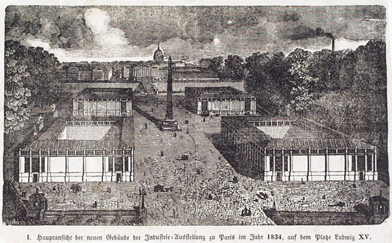 Hauptansicht der neuen Gebäude der Industrie-Ausstellung zu Paris im Jahr 1834, auf dem Platze Ludwig XV