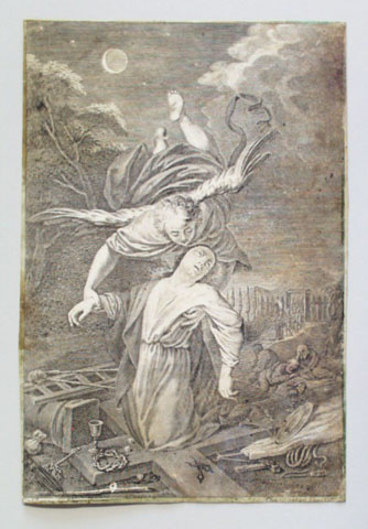 Kupferstich; 23,6 x 16 cm. - Ringsum beschnitten, Künstlerangabe teilweise handschriftlich ergänzt. - Stark fleckig. - Auf Leder aufgeklebt. - MIT DIGITALAUFNAHME