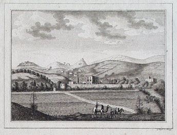 [Ansicht einer Hügellandschaft mit kastenförmigen Häusern, im Vordergrund Felder]