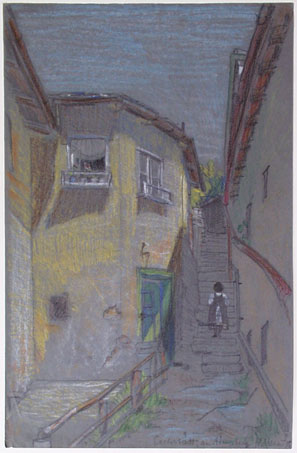 [Blick von unten auf eine ansteigende Steintreppe, beidseitig eingefaßt von Häusern]