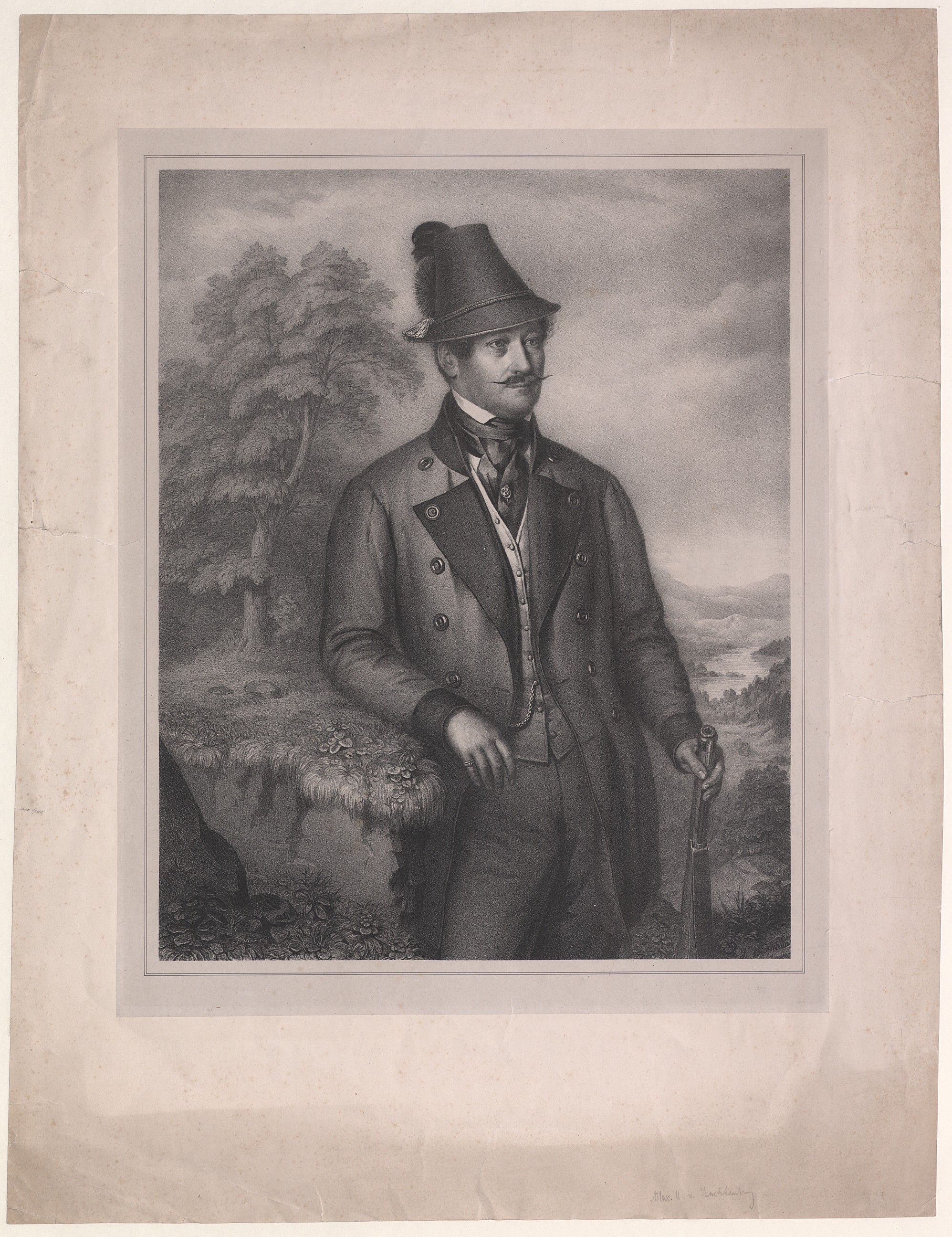 [Kniestück in Jagdkleidung in einer Landschaft]
