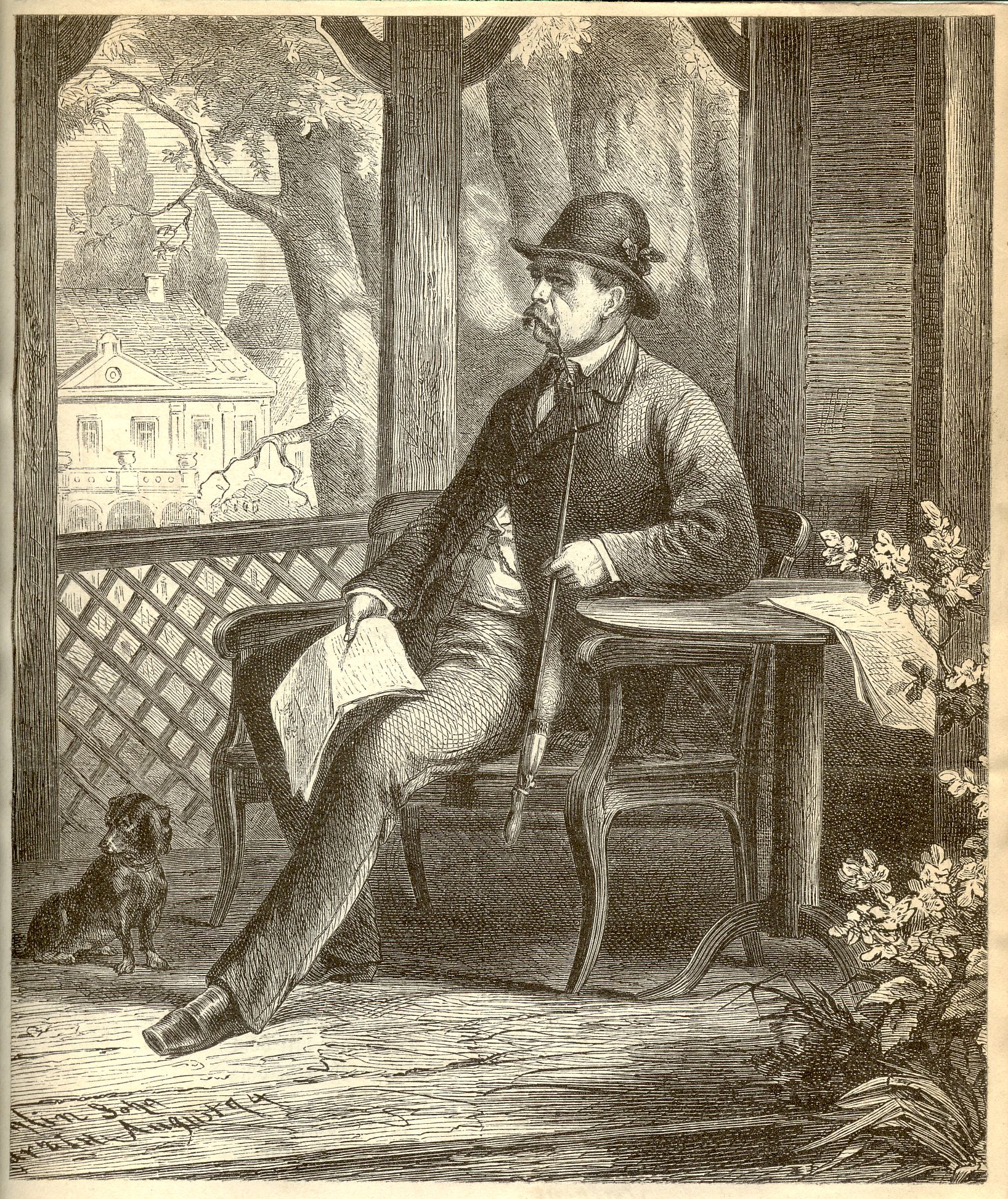 [ganze Figur, auf der Terrasse sitzend, nach links]