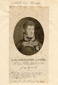 Radierung und Punktiermanier; 9,1 x 7,3 cm (oval). - Plattenrand oben und an den Seiten beschnitten. - Auf Papier aufgeklebt, stockfleckig. - Provenienz: Franz Sales Romstöck. - Auf der Rückseite weiteres Porträt von Wrede (s. GS(3)5.586.1,2). - MIT DIGITALAUFNAHME