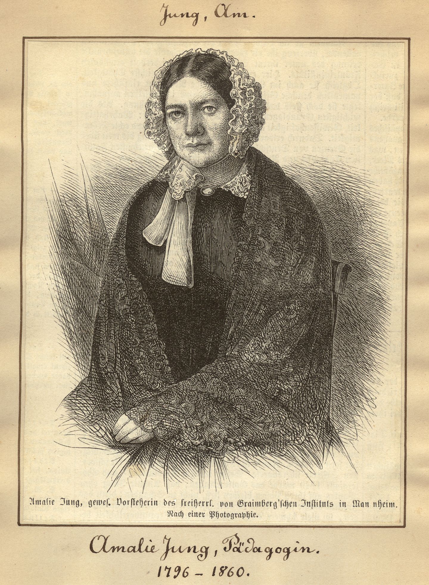 gewes. Vorsteherin des freiherrl. von Graimberg'schen Instituts in Mannheim ; Nach einer Photographie ; [Halbfigur nach links, sitzend]