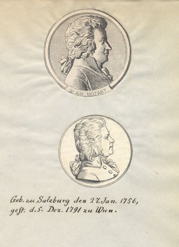 Geb. zu Salzburg den 27. Jan. 1756, gest. d. 5. Dez. 1791 zu Wien ; [Zwei Medaillons, jeweils mit Brustbild im Profil nach rechts]
