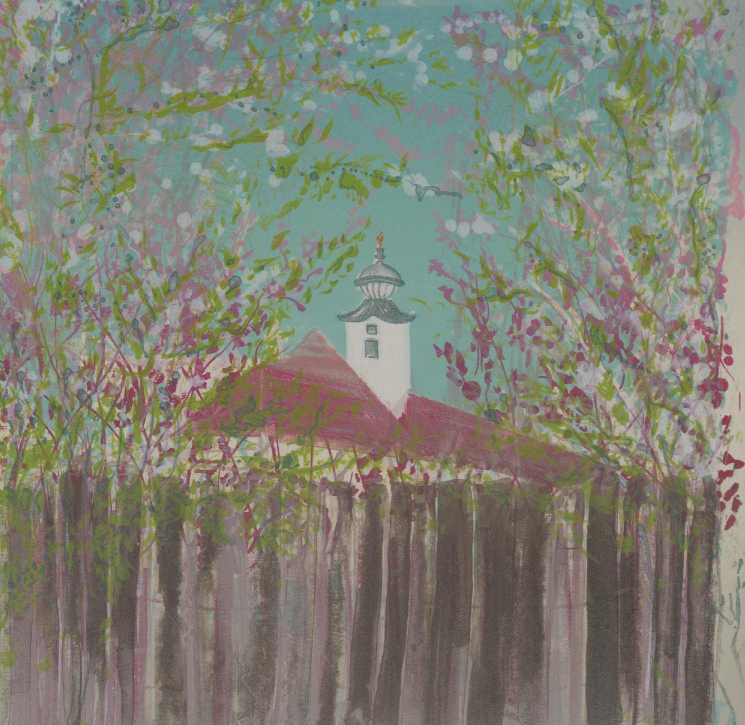 [Blick über einen Zaun auf Dach und Turm der Kirche]