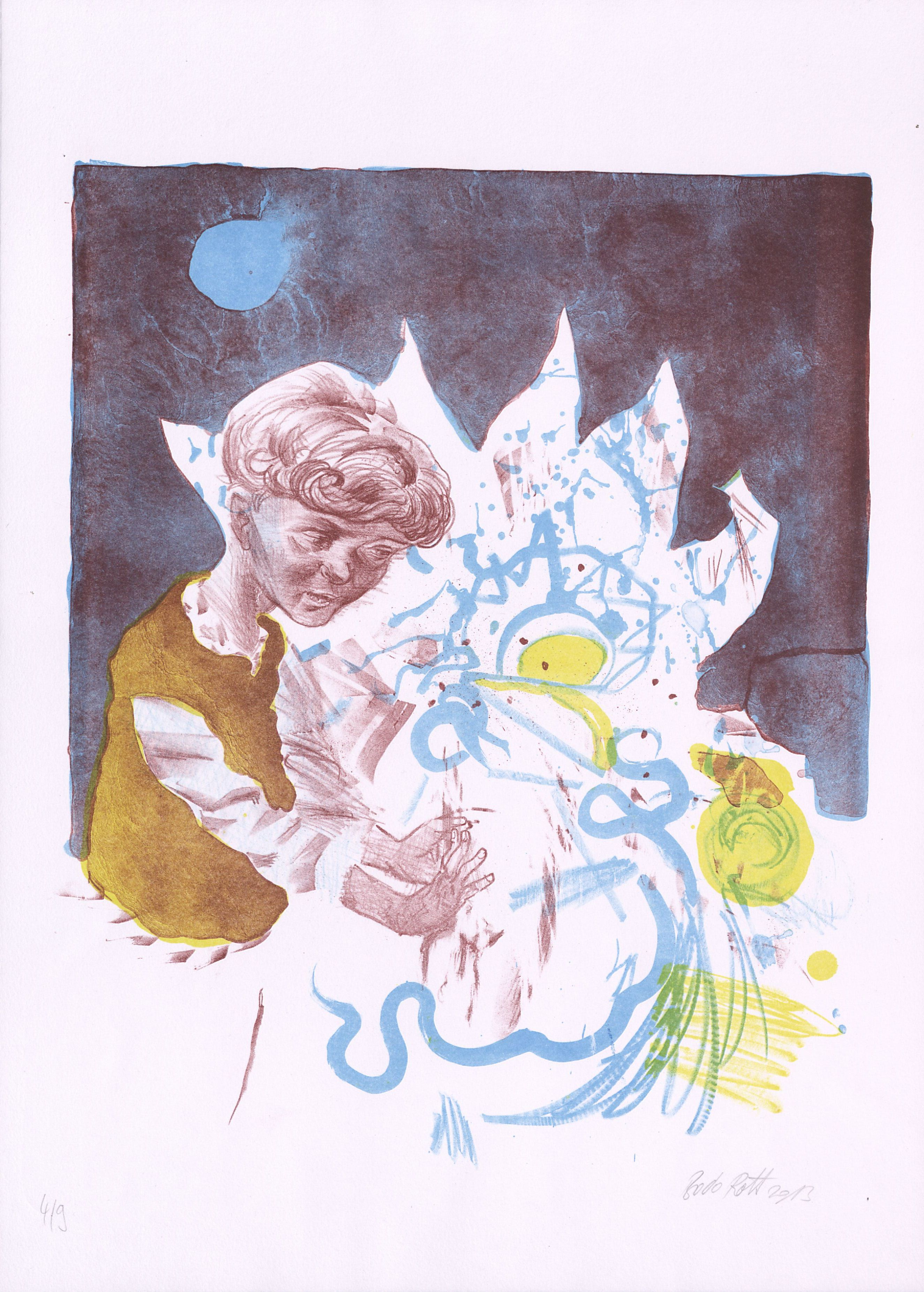Lithographie (Kreide, Tusche; 3 Farben); ca. 48,5 x 39 cm (Bild) bzw. 63,4 x 45,7 cm (Blatt). - Links oben und rechts unten je ein kleines Loch im Papier (außerhalb des Bildes). - Vom Künstler mit Bleistift bezeichnet (auf der Rückseite), datiert, numeriert (4/9) und signiert. - MIT DIGITALAUFNAHME