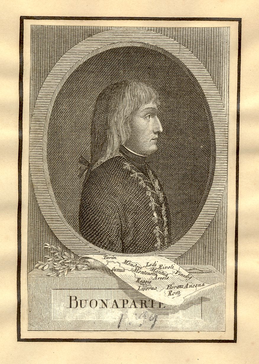 [als General, Halbfigur im Profil nach rechts, im Oval, darunter Karte mit Teilen Italiens]