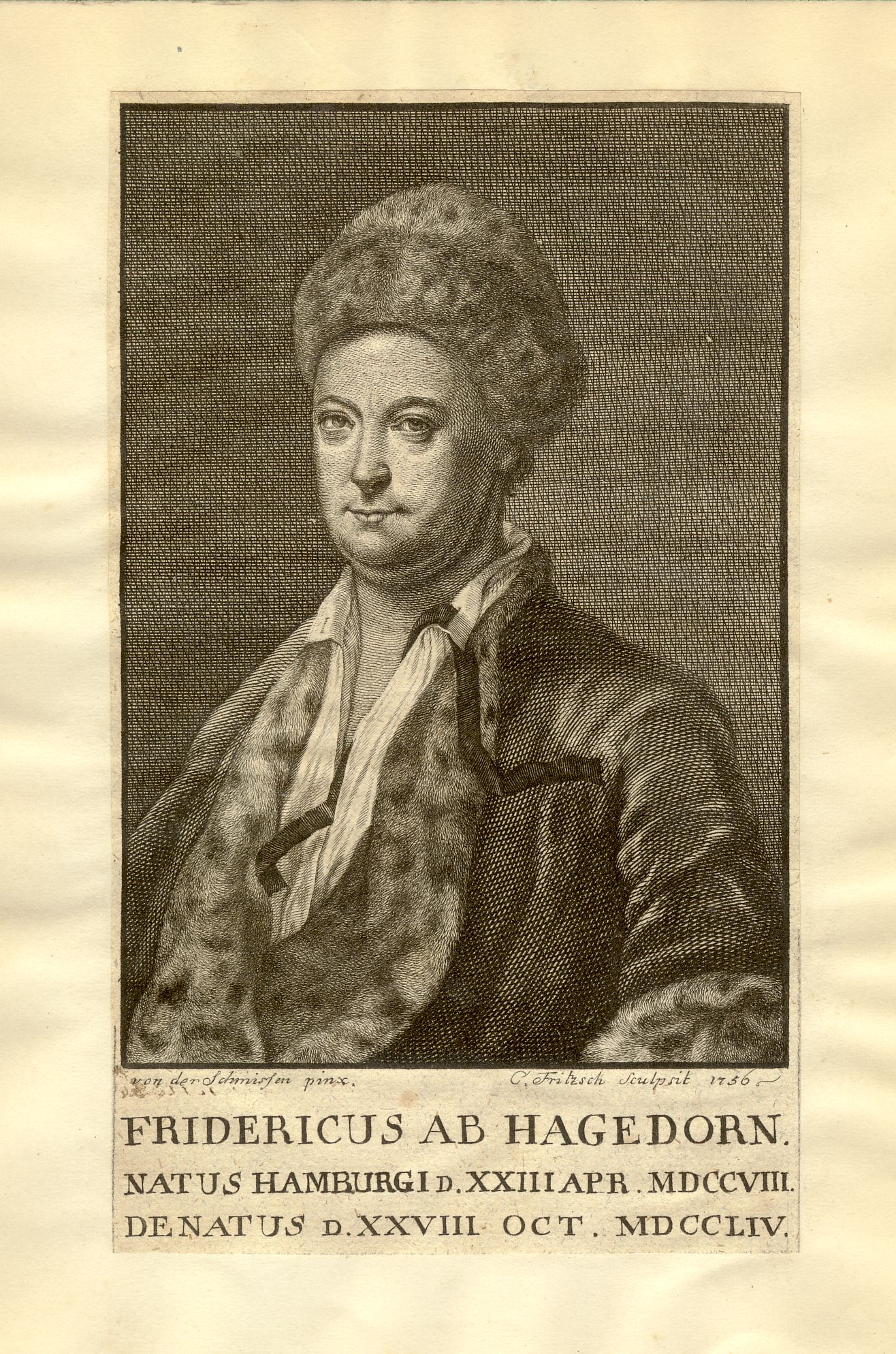 Allgemeiner Porträt-Katalog / hrsg. von Hans Dietrich von Diepenbroick-Grüter, S. 309, Nr. 10374. - Singer, Hans Wolfgang: Allgemeiner Bildniskatalog, Nr. 35999 und 36000. - Katalog der graphischen Porträts in der Herzog August Bibliothek Wolfenbüttel 1500-1850, Reihe A: Die Porträtsammlung, Nr. A 8584. - Frontispiz zu: Hagedorn, Friedrich von: Sämmtliche Poetische Werke. Erster Theil. - Hamburg : Johann Carl Bohn, 1757 und 1760