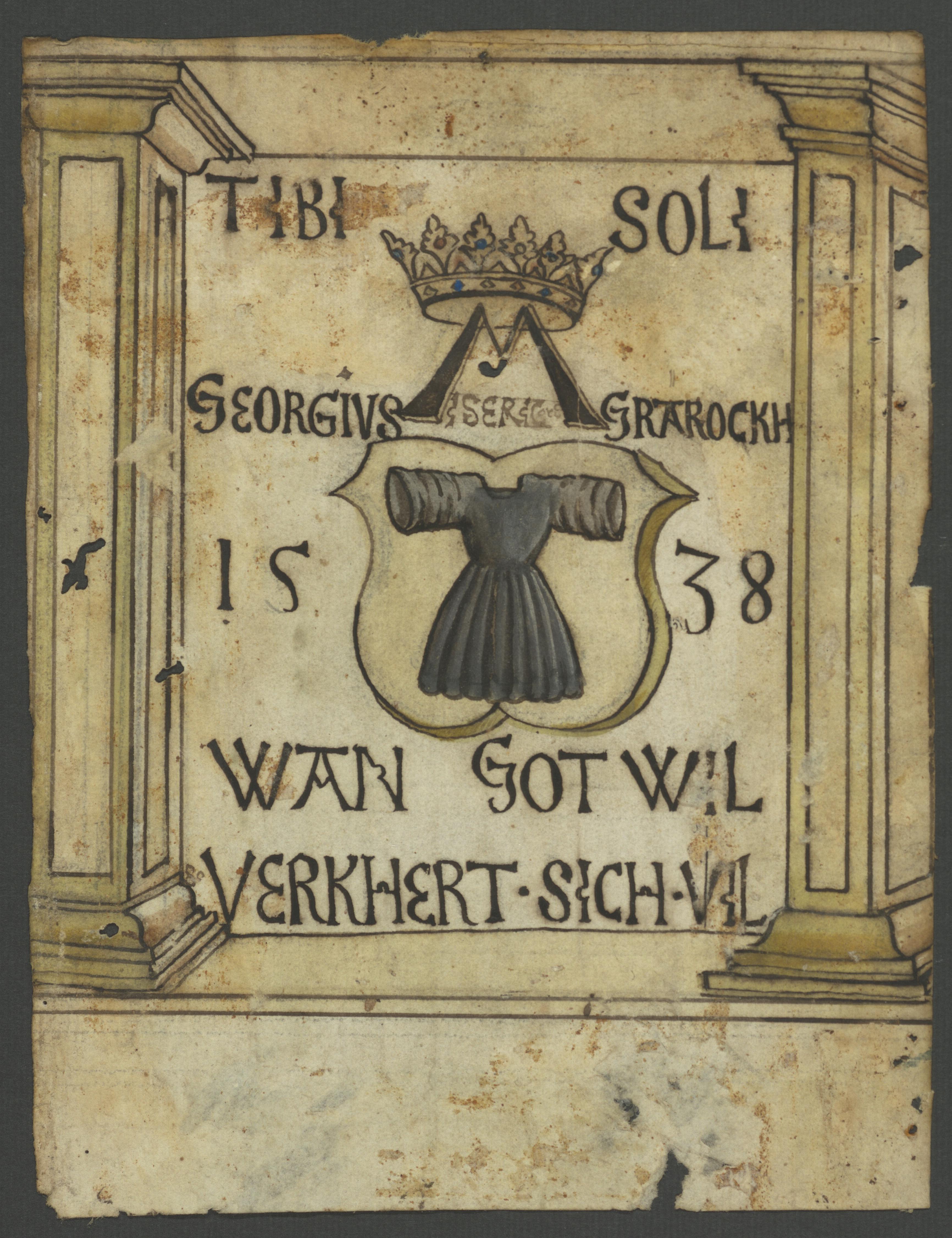 Feder in braun über Bleistift, gelb und grau laviert, auf Pergament; 22 x 20,6 cm. - An den Seiten beschnitten. - Fleckig und wurmstichig. - Provenienz: Kapuzinerkloster Laufen, zuletzt Zentralbibliothek der Bayerischen Kapuziner, Altötting (ausgelöst aus: 18/BC 2505 E19.537 ; als Dauerleihgabe im Diözesanmuseum Eichstätt). - Ein unten beschnittenes (unvollständiges?) und verändertes 2. Exlibris liegt bei. - MIT DIGITALAUFNAHME