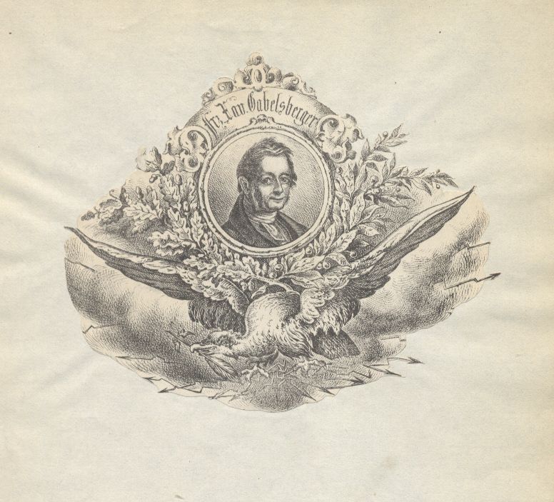 [Brustbild nach rechts in einem mit Zweigen geschmückten Medaillon, darunter ein Vogel mit ausgebreiteten Flügeln und Wolken, von denen Blitze ausgehen]