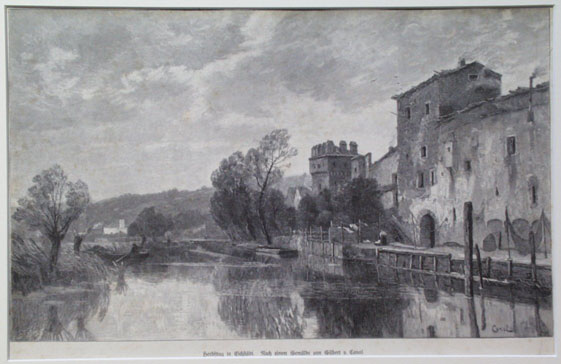 Nach einem Gemälde von Gilbert v. Canal ; [Ansicht eines Teils der alten Stadtmauer mit Turm an der Altmühl]