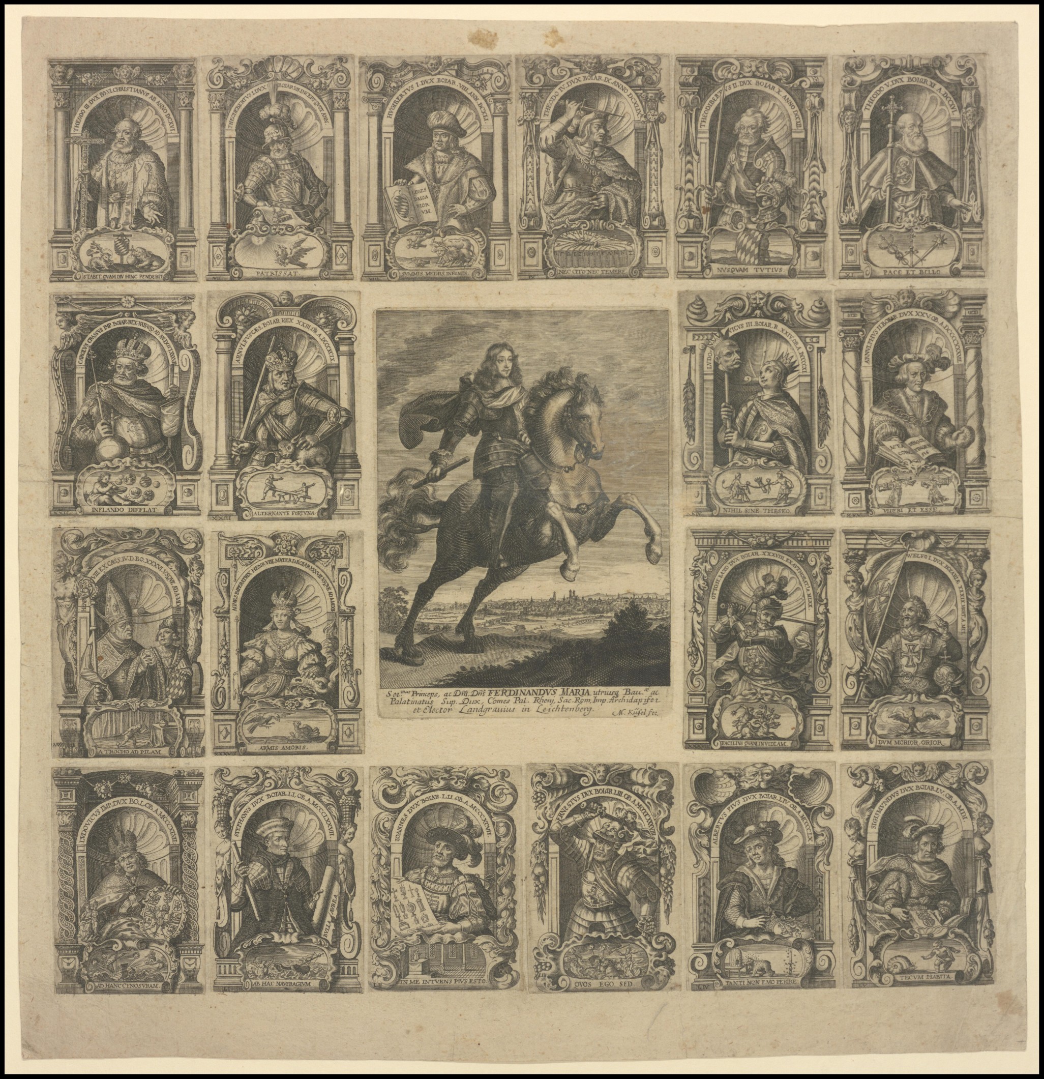 Radierung und Kupferstich; 17 x 12,4 cm (Portrait Ferdinand Maria, Plattengröße) bzw. je ca. 9,5 x 6,5 cm (Einzelbildnisse, Plattengröße); Blattgröße ca. 42,5 x 41,5 cm. - Kleiner Einriß Mitte rechts und unten rechts, einige Falten und Flecken. - MIT DIGITALAUFNAHME