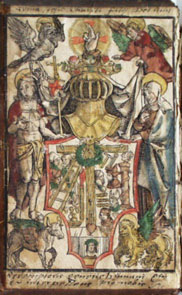 [Wappenähnliche Darstellung: Helm über einem Wappenschild mit den Leidenswerkzeugen Christi, daneben Jesus Christus und Maria, in den Ecken die Symbole der vier Evangelisten: Adler, Engel, Stier und Löwe]