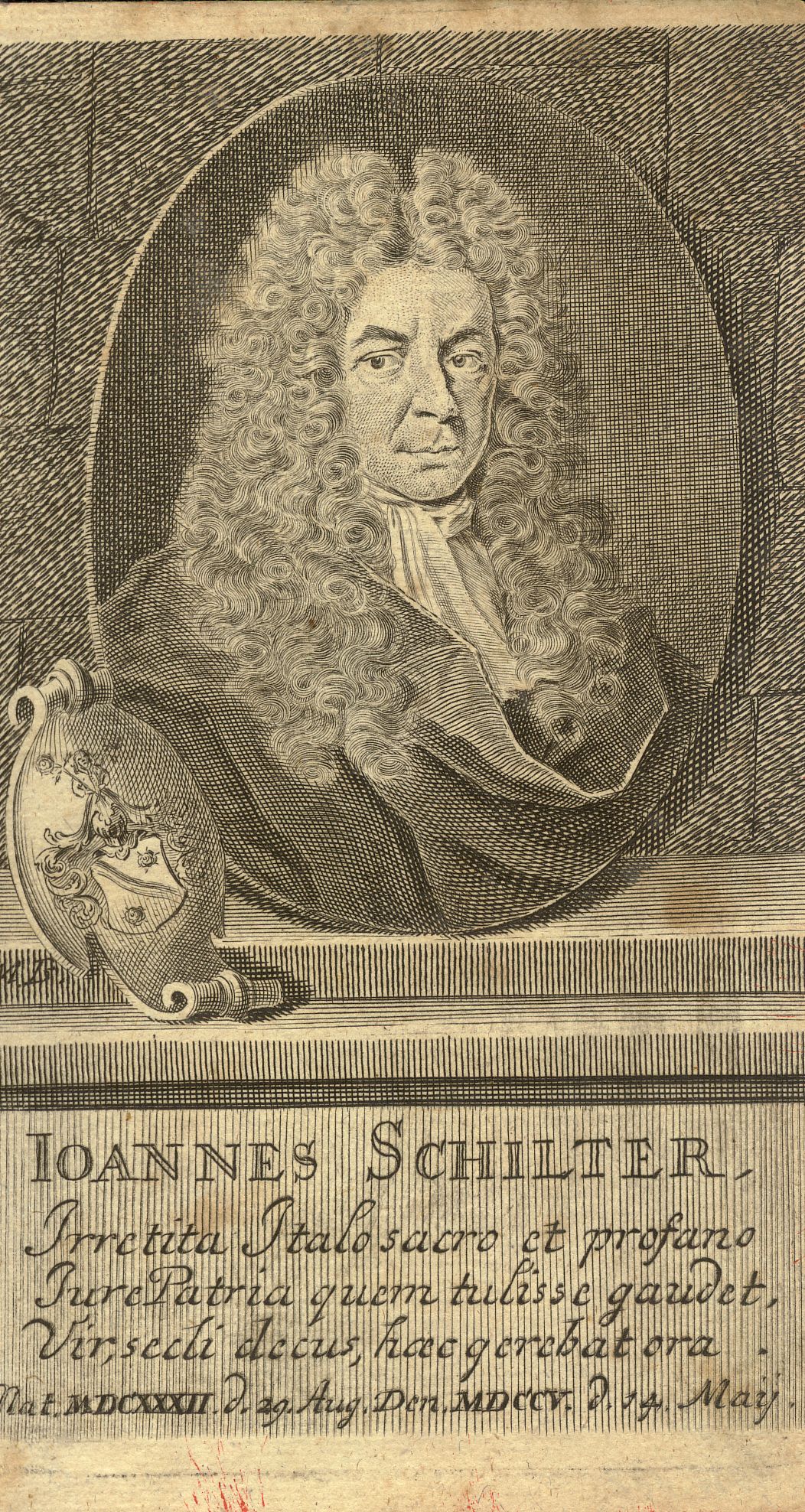 Singer, Hans Wolfgang: Allgemeiner Bildniskatalog, Nr. 81347. - Katalog der graphischen Porträts in der Herzog August Bibliothek Wolfenbüttel 1500-1850, Reihe A: Die Porträtsammlung, Nr. A 19137. - Frontispiz zu: Schilter, Johann: Institutiones Iuris Canonici ad Ecclesiae veteris et hodiernae statum accomodatae. - Frankfurt a.M./Leipzig : Matthäus Birckners Erben, 1718 bzw. 1721