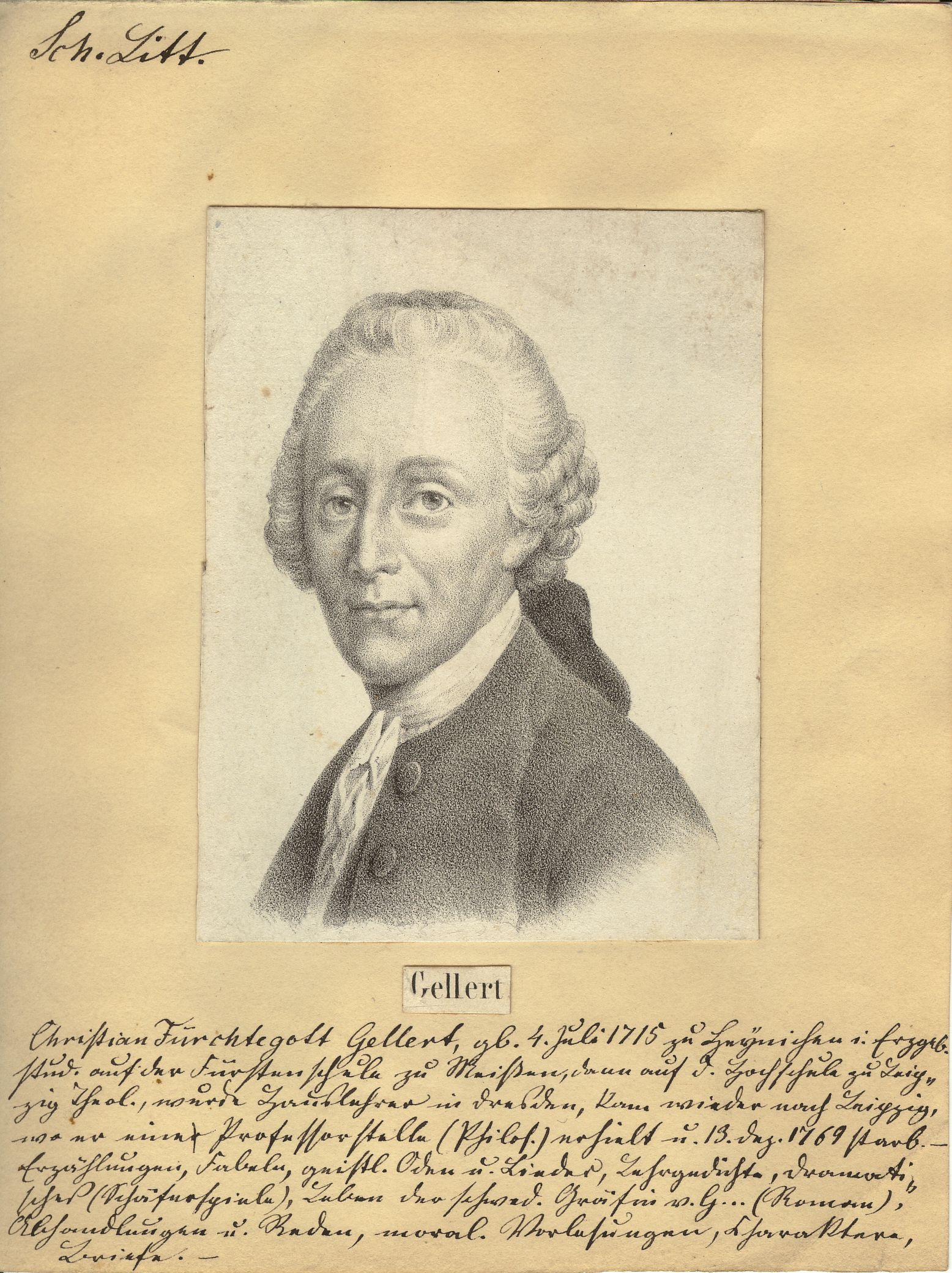 Kreidelithographie; ca. 8,8 x 6,5 cm. - Ausgeschnitten und auf Papier mit handschriftlichem Lebenslauf aufgeklebt. - MIT DIGITALAUFNAHME