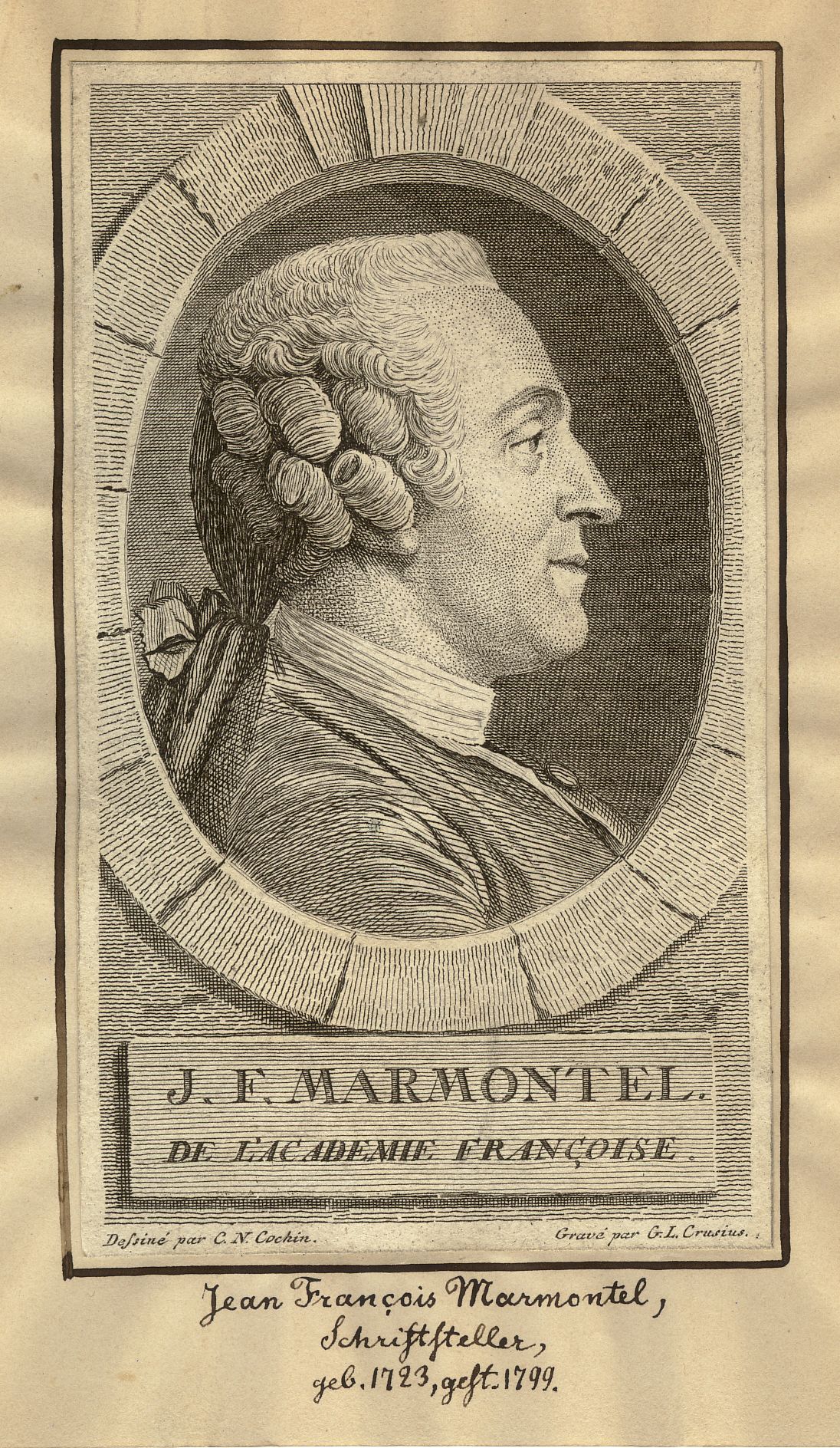 Frontispiz zu: Marmontel, Jean Francois: Contes moraux. - Leipzig : S. L. Crusius, 1766, 1. Bd. - Vgl.: Katalog der graphischen Porträts in der Herzog August Bibliothek Wolfenbüttel 1500-1850, Reihe A: Die Porträtsammlung, Nr. A 13488. - S.a.: Allgemeiner Porträt-Katalog / hrsg. von Hans Dietrich von Diepenbroick-Grüter, S. 489, Nr. 16315. - Singer, Hans Wolfgang: Allgemeiner Bidniskatalog, Nr. 60906 u. 60913